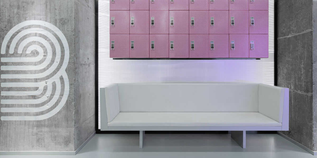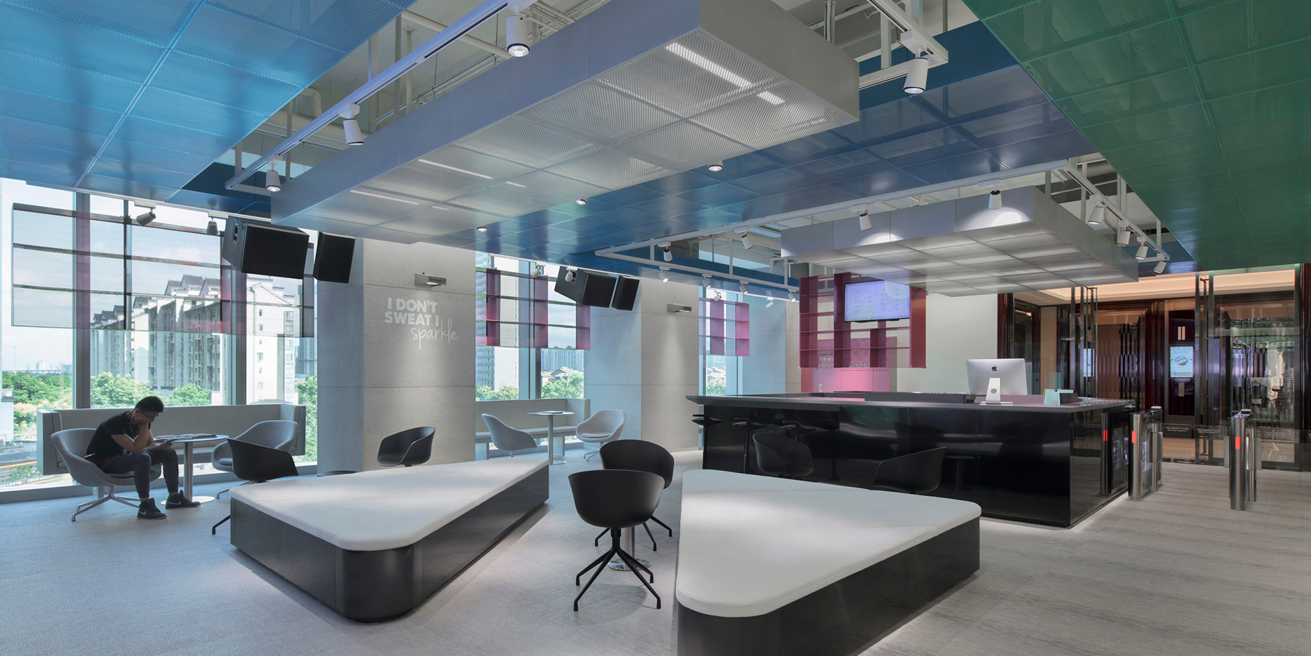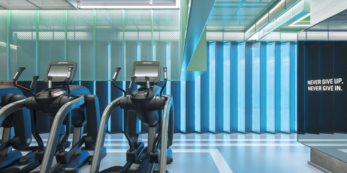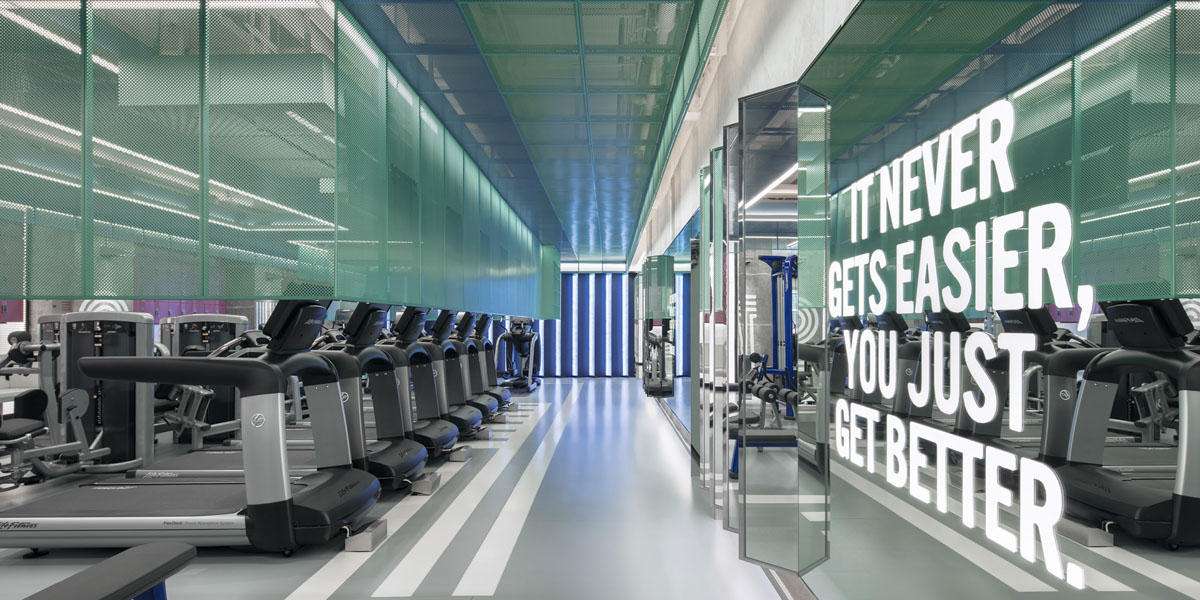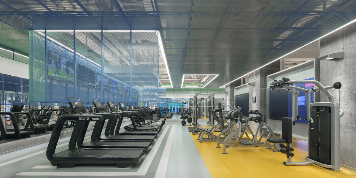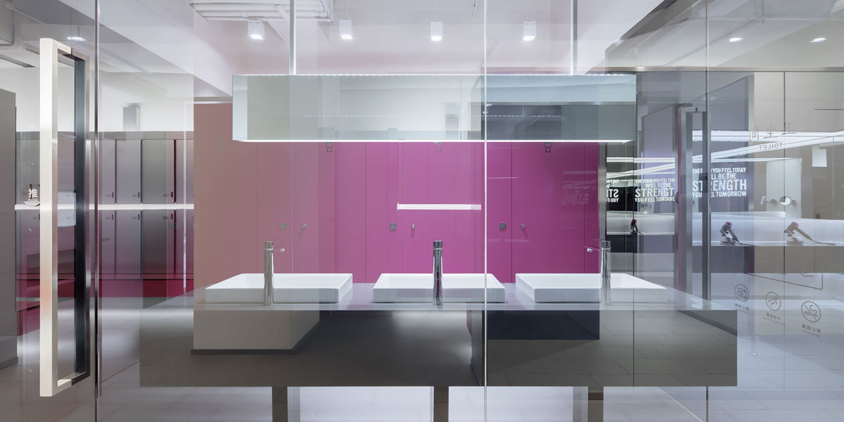 设计的亮点来自从天花上大面积悬挂的金属网吊架,粉、蓝、绿、银的搭配不仅赋予空间独一无二的视觉体验,亦打造其整体多维立体感,并留出充裕的地面空间服务于多样化的训练功能。通高的镜面墙体配合半透明的聚碳酸酯板不仅令空间在视觉上更为开阔,镜面反射亦让空间如万花筒一般呈现一种迷幻灵动的3D效果,墙上的标语也因此显得更为有力,激励人心。同时,从实用的角度,这样的空间设计满足了足够的存储空间以及随处不在的休憩区域,地面通过PVC板上的平面图案区分不同功能区域,令空间特性鲜明强烈,也保留了健身房干净整洁的极致美学。