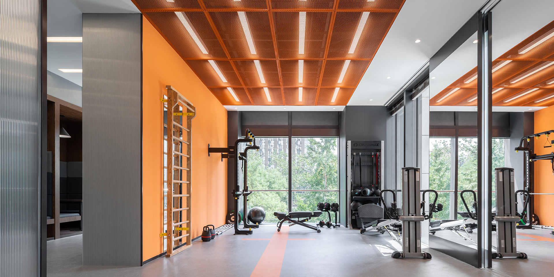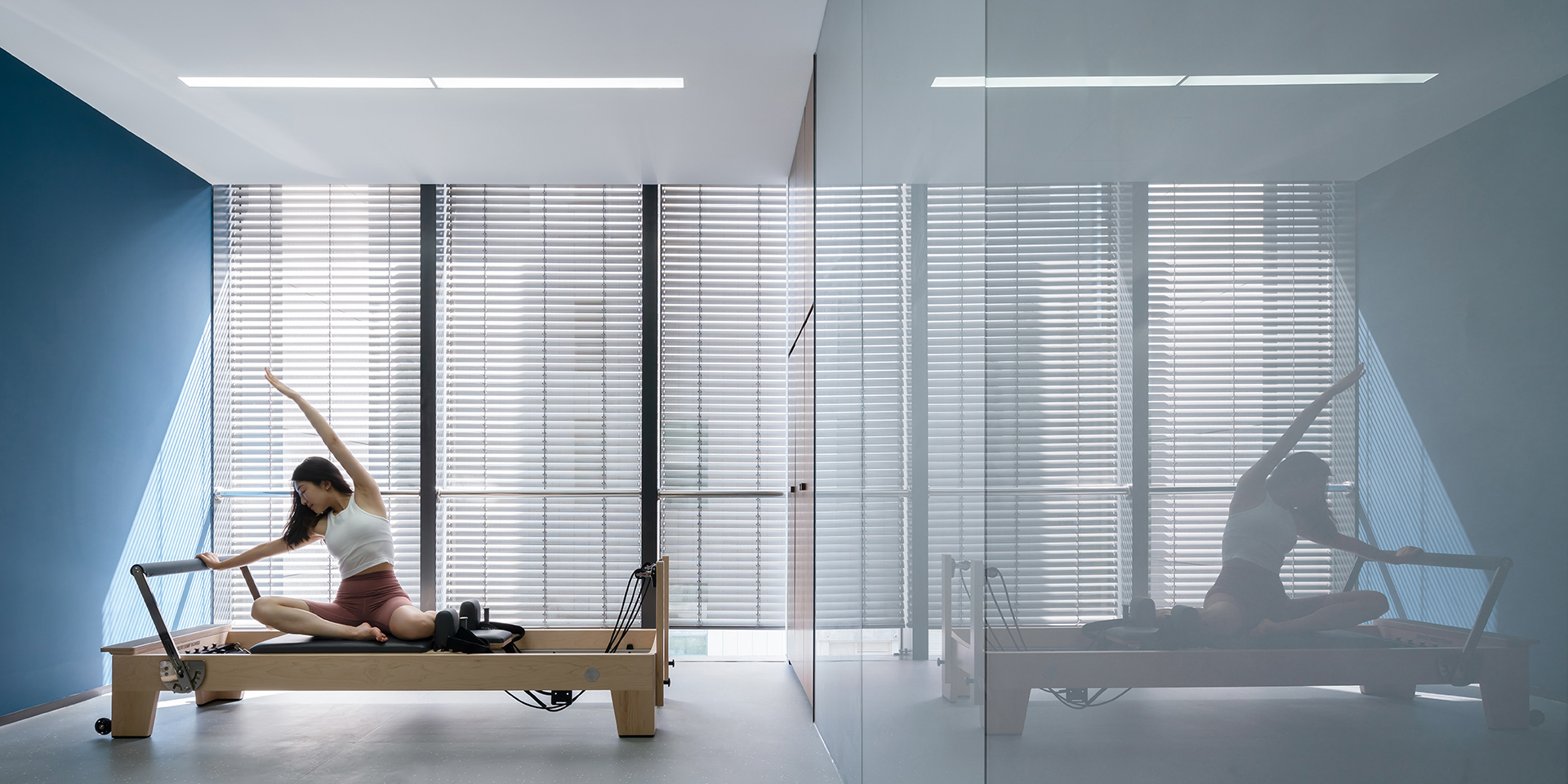 Die Farbgestaltung prägt die Atmosphäre: Kühle Grau- und Blautöne vermitteln Präzision und Professionalität, während lebendige Orangenuancen Wärme, Optimismus und Energie einbringen. Der elegante Empfang öffnet sich zu einem lichtdurchfluteten Trainingsbereich, dessen transparente Trennwände Einblicke in den Genesungsprozess gewähren. Spiegel und raumhohe Fenster verstärken das Gefühl von Weite und Leichtigkeit.