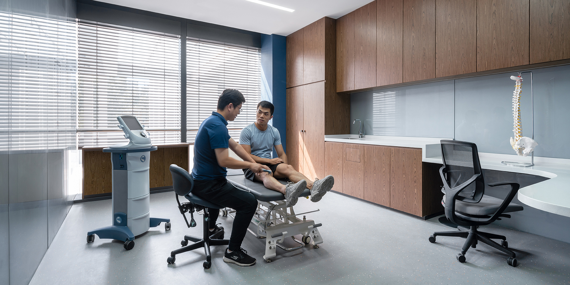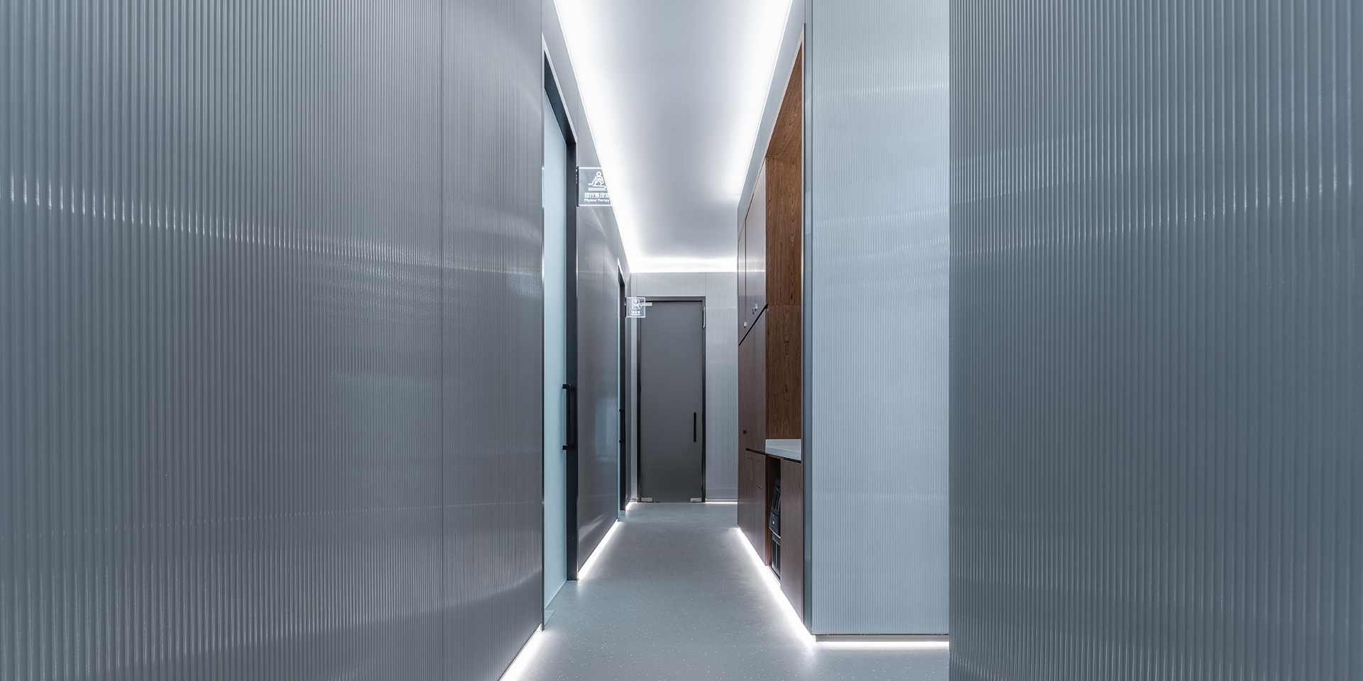 Ein Korridor führt zu vier privaten Behandlungsräumen und einem Ärztebüro, wo blaue Wände, Holzakzente und sanftes Tageslicht eine ruhige, präzise Eleganz schaffen.