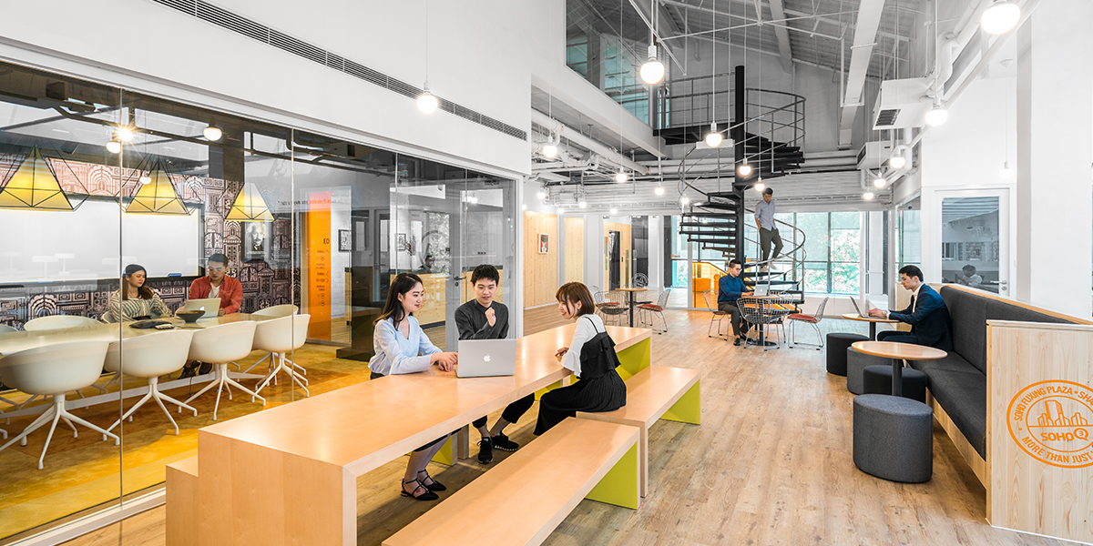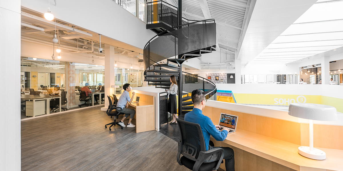 Closely following the completion of FXP E, anySCALE recently wrapped up its work on SOHO 3Q’s FXP C location, bringing the total number of projects within Fuxing Plaza to three. Connected via rooftop terraces, these separate wings of the plaza earlier housed retail outlets, and were transformed to accommodate the 3Q offices. The distinct branding for 3Q was maintained by using the signature colors of orange and yellow on the accent wallpapers, glass railings, mix-and-match furniture and rugs. The two charcoal gray spiral staircases featured prominently in the central areas provide structural contrast, and muted geometric patterns on wallpapers lend an effortlessly stylish appeal. A unique point is the choice of fittings, with a large part of the artificial light coming from minimalist fixtures suspended uniformly over most areas. The bright and airy effect is enhanced by the exposed ceilings completely painted white, bouncing off any glow from the sun or the bulbs themselves.