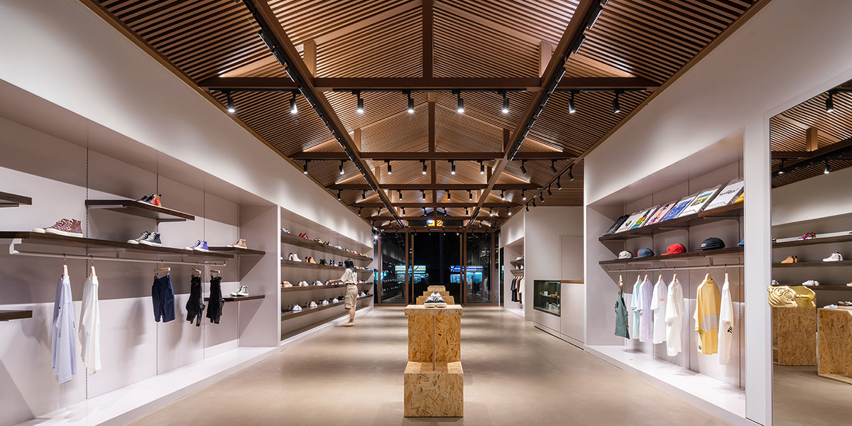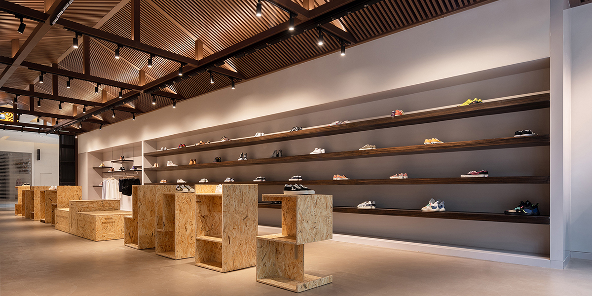 Im Inneren strukturieren freistehende Präsentationselemente, eingelassene Regale und ein zentraler Counter den länglichen Grundriss. Eine Nussbaumvitrine mit rotierenden Sockeln zeigt Sneaker aus allen Perspektiven. Die Fassade, die das Lamellendach nach oben fortführt, verleiht dem Store markante Sichtbarkeit und architektonische Präsenz.