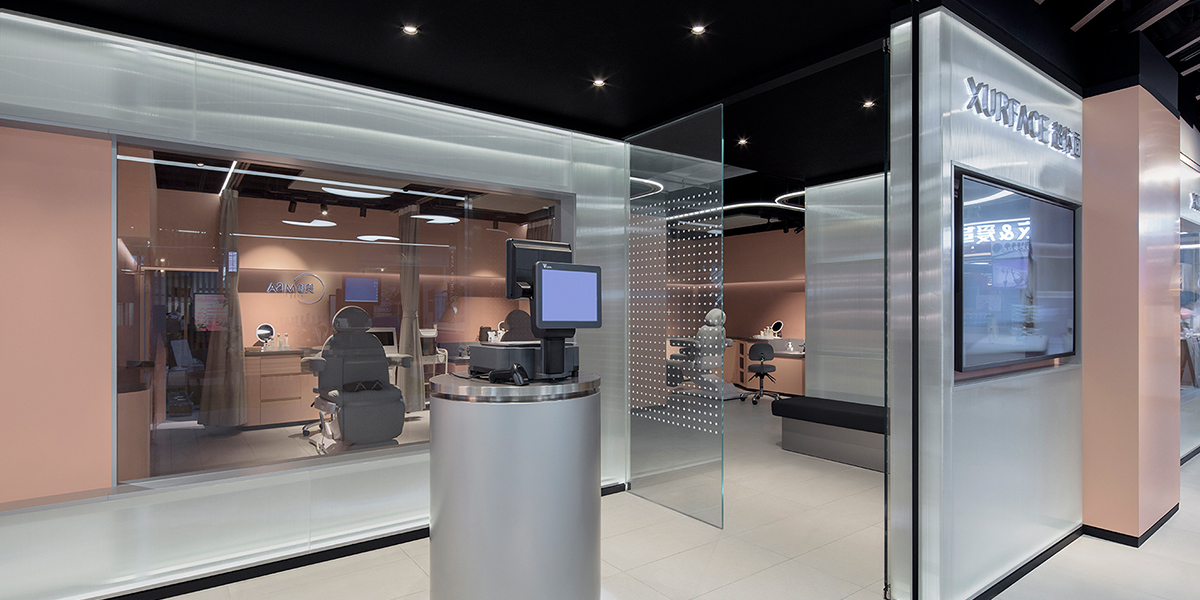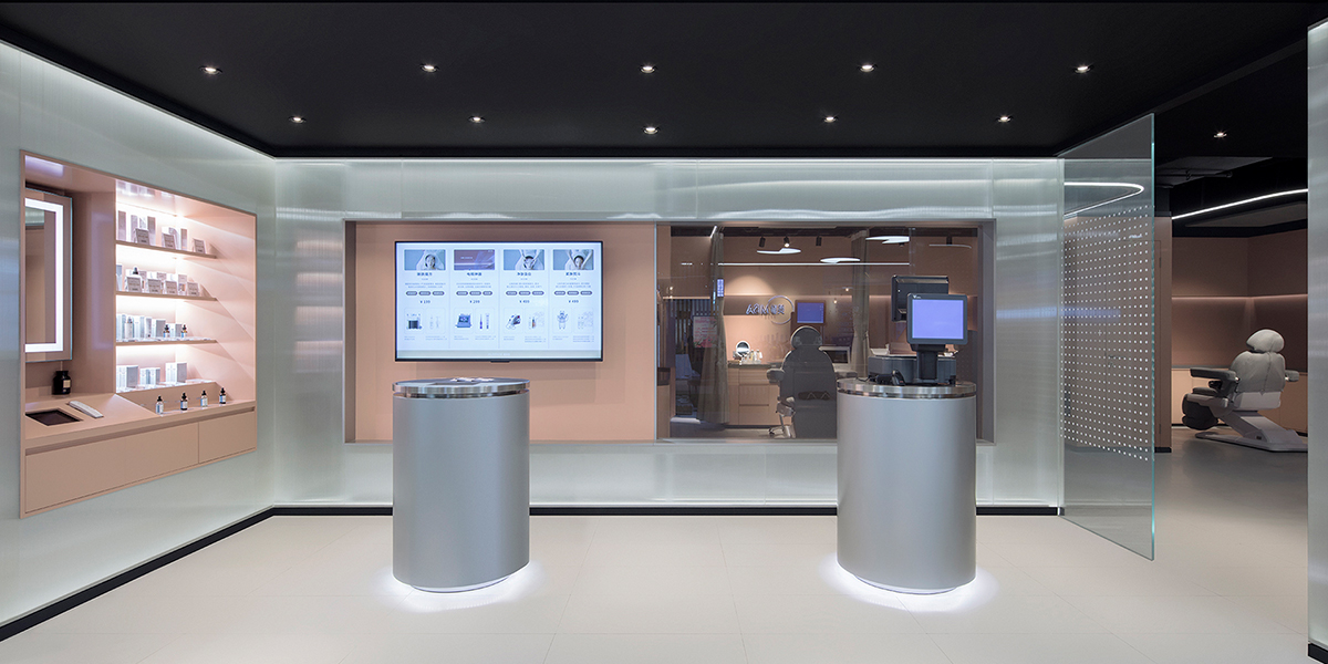 为了诠释品牌自身结合美容SPA与零售超商的前卫理念,店面的设计风格简单利落、线条流畅,并强调通透感及内部互通性。肤感的石膏板及防火板墙、及透过间接光源打亮的聚氨酯板、两种材质的层叠运用,不仅将品牌重推的护肤产品进行完美展示,亦令空间的最终呈现干净且通透。美容护理区域通过帘幕分隔,将小空间进行最大优化,同时满足消费者使用过程中的灵活可变性。