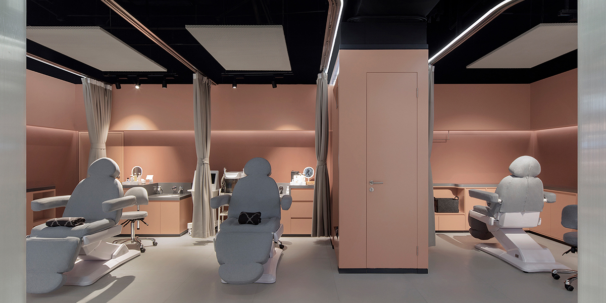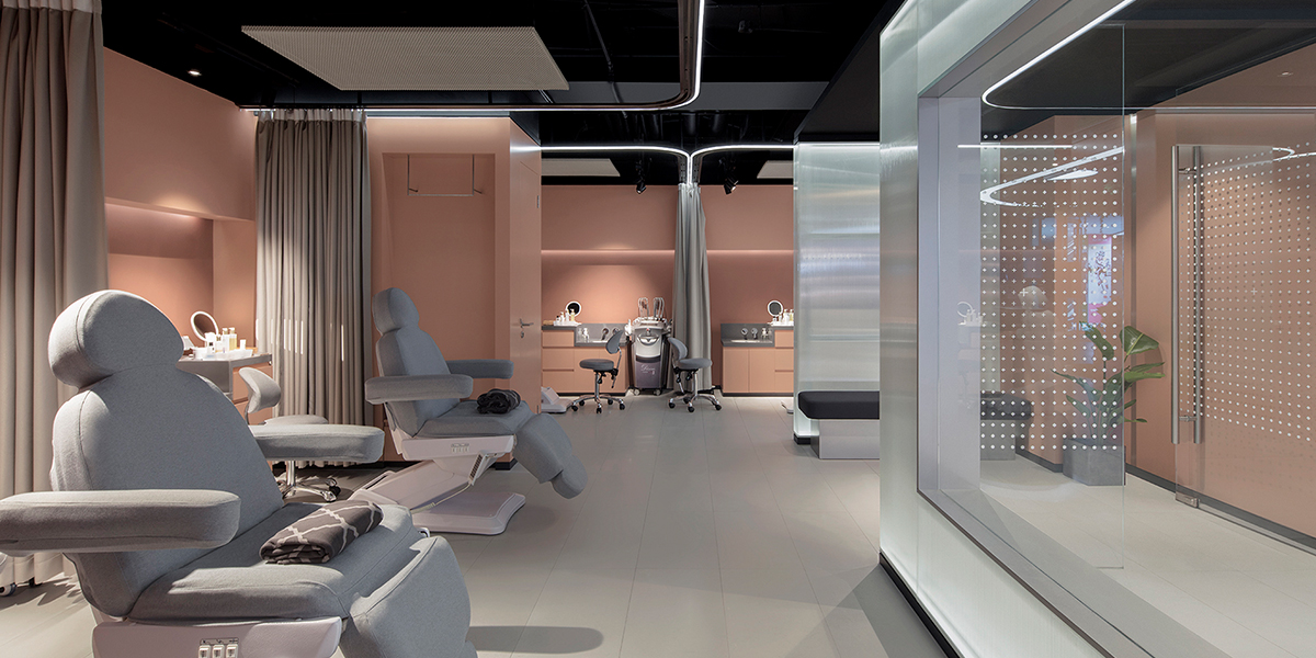 To match the future-forward concept of the spa and supermarket, the design settled upon was decidedly sleek, transparent, and interconnected. Perimeter walls made of laminate and plasterboard in skin-toned hues were ‘drenched’ with polished polycarbonate emulating a hydrating sheet mask. Treatment areas are divided using curtains to maximize the small pace and allow flexible use depending on client needs. The main balance sought by the design was to create an uber-comforting space that was relaxing yet fast, and private yet open. Indirect lighting and soothing colors create a Zen environment that invites weary shoppers to immerse themselves in their surroundings and feel mentally refreshed.