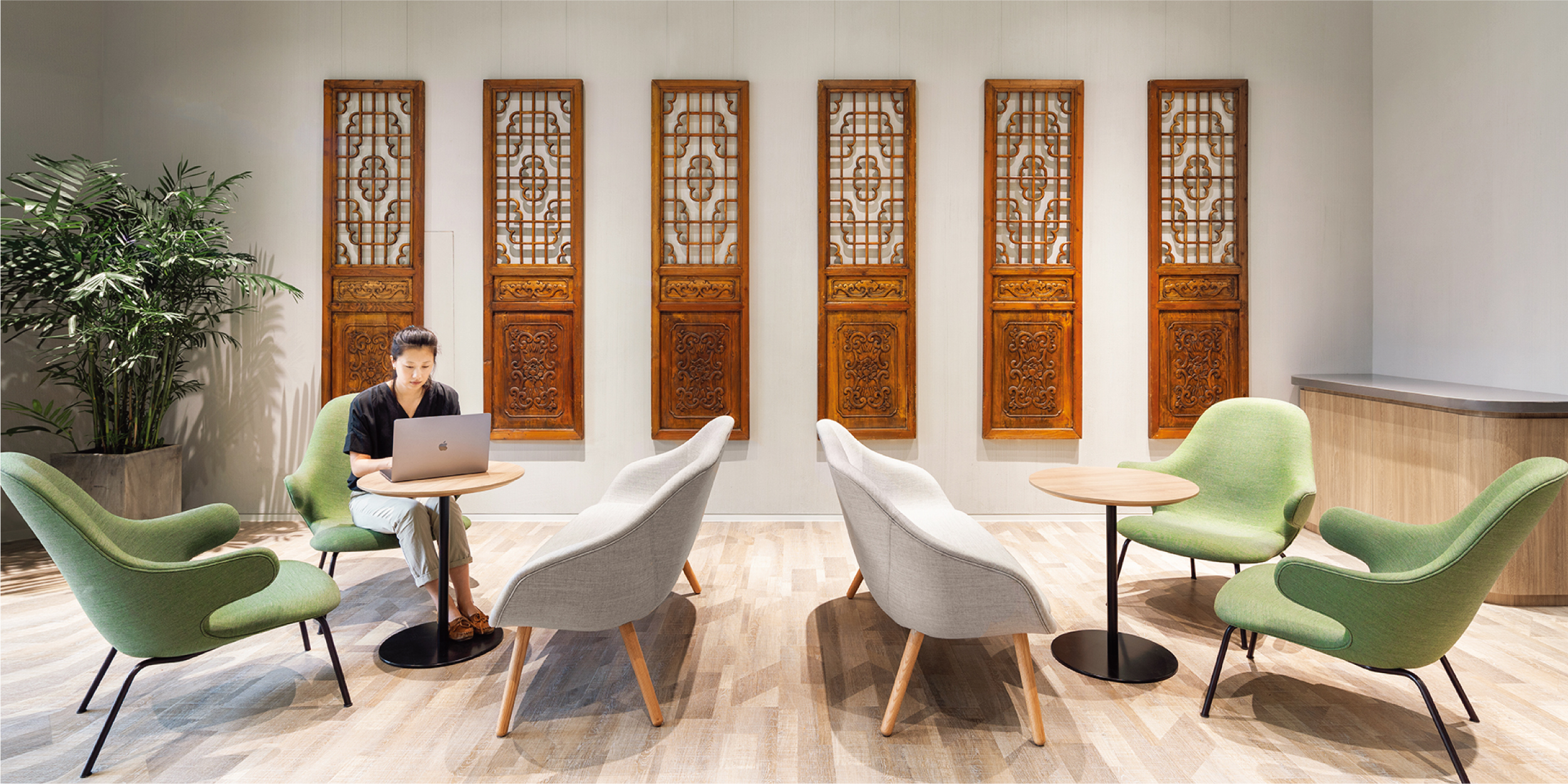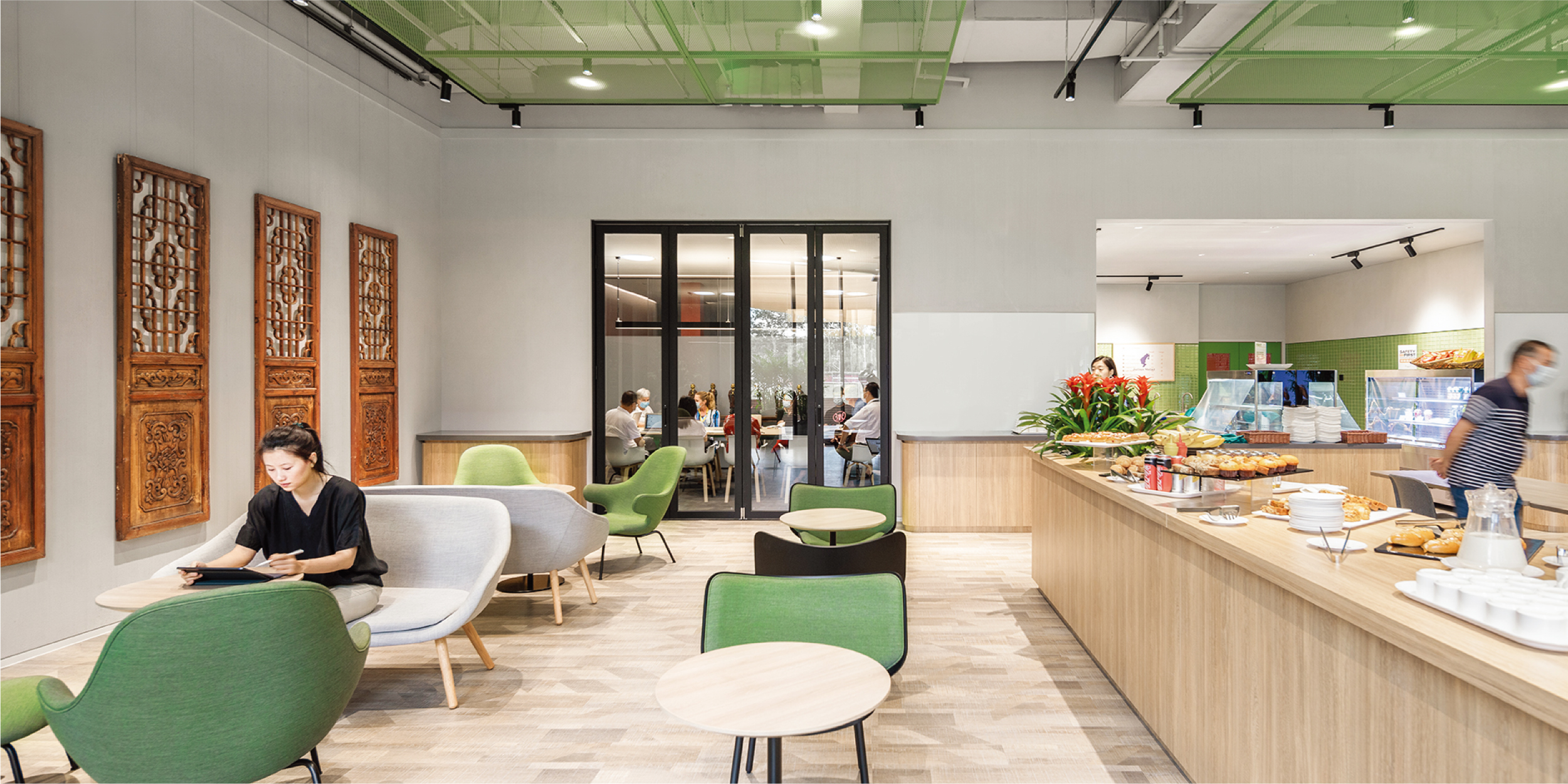 Das Interieur erinnert an ein urbanes Loft mit Lounge-Charakter – offen, flexibel und einladend. Unterschiedliche Ebenen und Möblierungen schaffen Abwechslung: Stufen zum Sitzen und Arbeiten, Café-Tische zum Essen, ruhige Ecken für Gespräche. Mobiliar lässt sich verstauen, wenn die Bühne für Veranstaltungen genutzt wird. Ein maßgefertigtes Lichtkonzept unterstreicht die sanfte Farbwelt aus Holz, Grau und zarten Grüntönen.