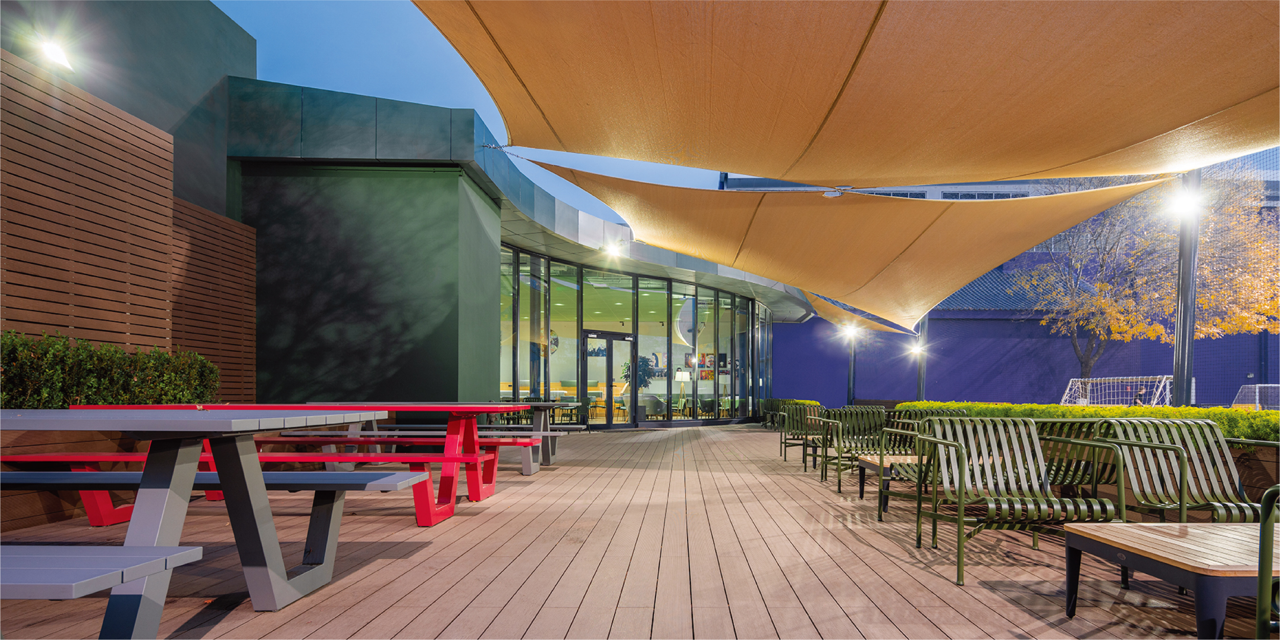 Auch die Terrasse im Außenbereich lädt zum Verweilen ein – mit Stufen, Sonnensegeln, Pflanzen und Lounge-Möbeln bietet sie den idealen Rahmen, um das Geschehen auf dem Spielfeld bei einem Kaffee zu genießen.