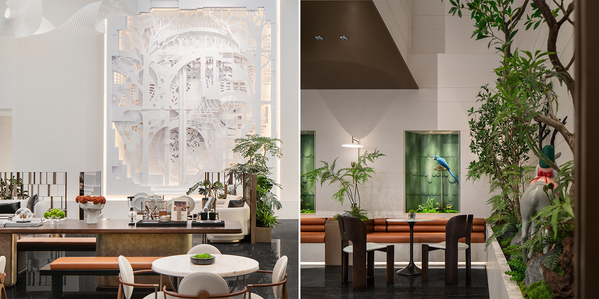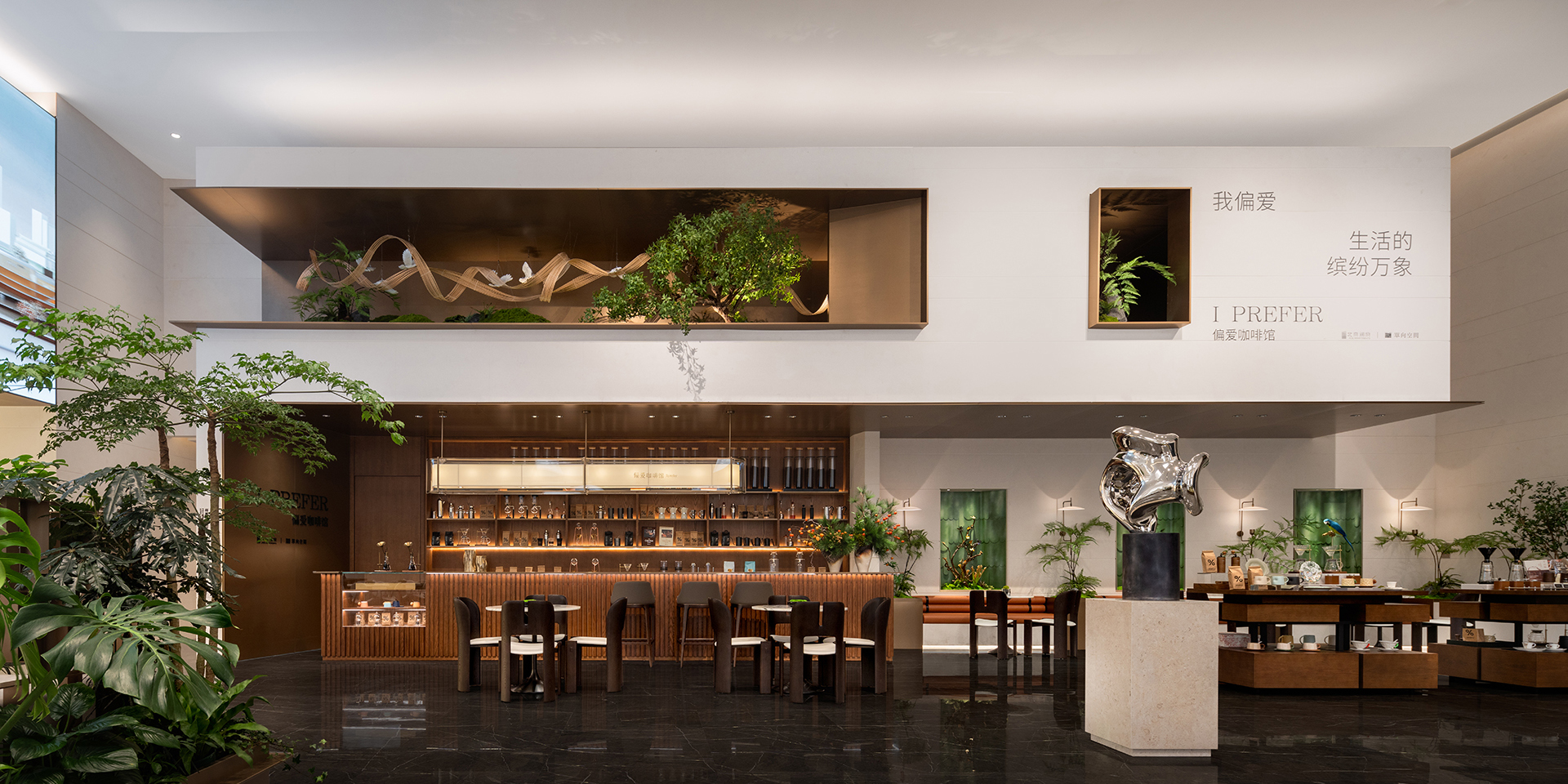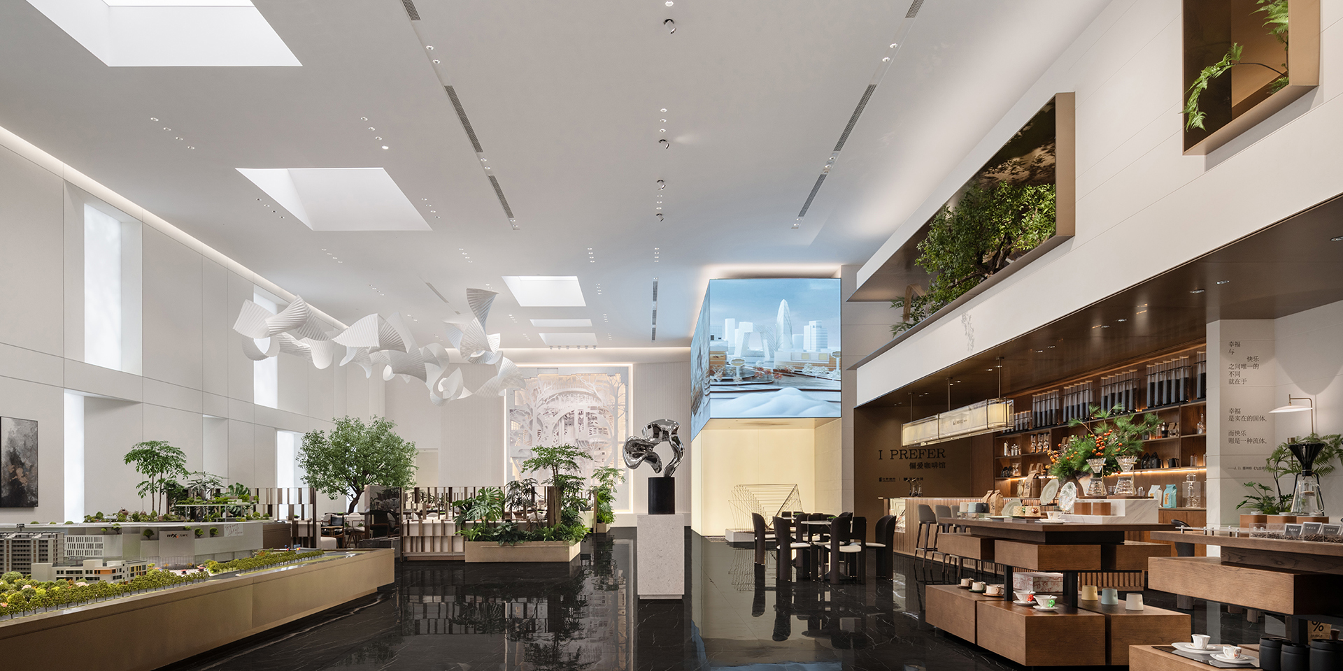 Entlang der Wegeführung öffnet sich ein rund acht Meter hohes Atrium, das Café-, Lounge-, Beratungs-, Modell- und Verhandlungszonen aufnimmt. Decken- und Wandgestaltung folgen einer klaren architektonischen Logik: Kubische Nischen, in unterschiedlichen Winkeln aus dem Volumen geschnitten und modular organisiert, schaffen ein feines Spannungsverhältnis zwischen Ordnung und Variation. Intelligente, dimmbare Barrisol-Leuchten mit abstrakten, baumartigen Schattenspielen verändern sich im Tagesverlauf und evozieren die Atmosphäre eines ruhigen Innenhofs – ein Motiv, das in den Kaffee- und Besprechungsbereichen durch skulpturale, ineinandergreifende Formen wieder aufgenommen wird.