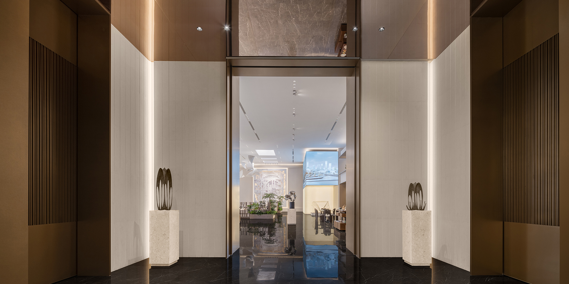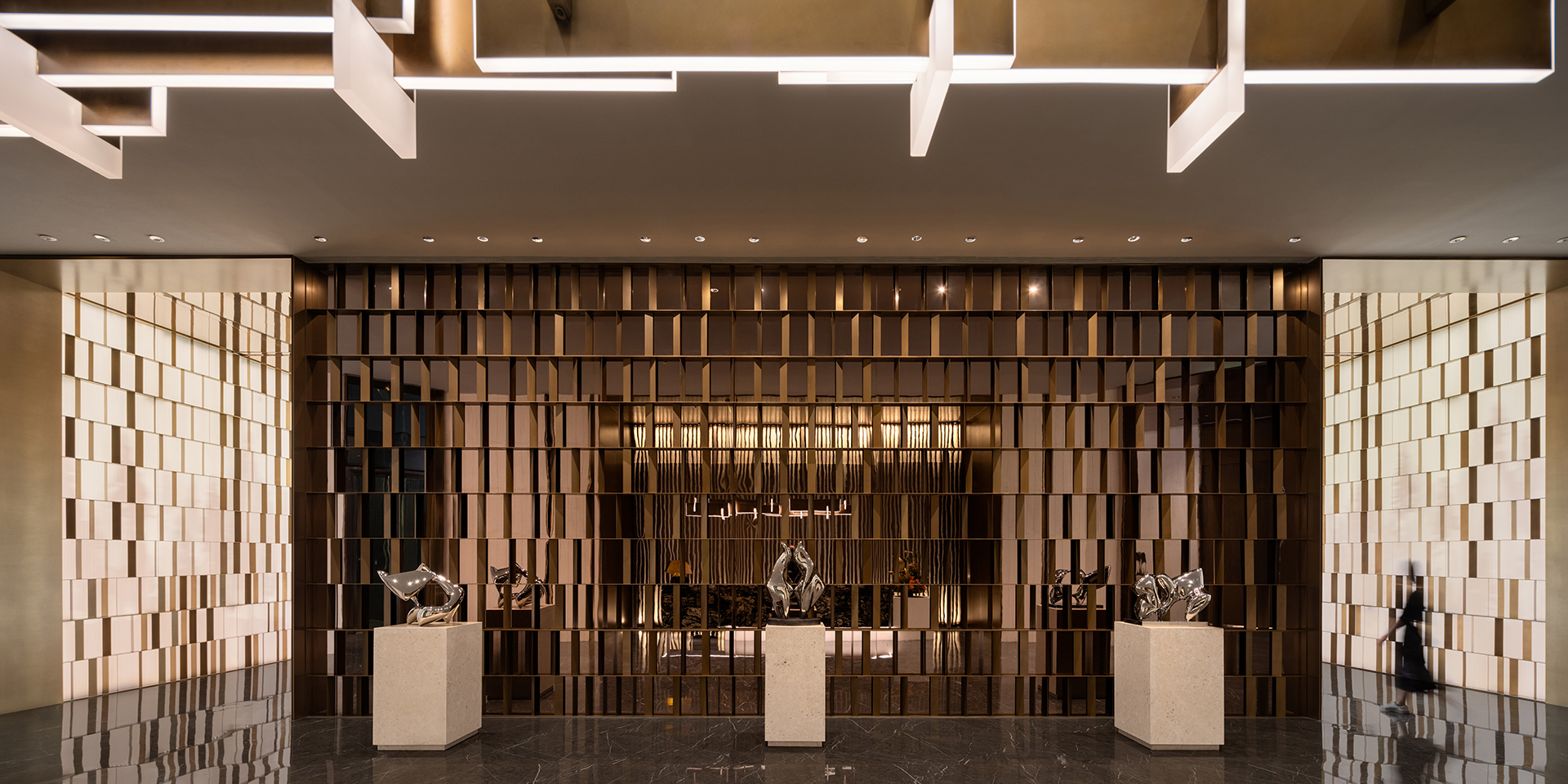 Schon im Eingangsbereich setzt eine aus unterschiedlich geneigten Metallpaneelen, integrierter Beleuchtung und Spiegelelementen komponierte Trennwand ein markantes Zeichen und definiert die Schwelle zum Innenraum. Der Empfangsbereich, geprägt von strukturiertem Marmor, Edelstahl und fein abgestimmtem Licht, strahlt ruhige Eleganz und Zurückhaltung aus.
