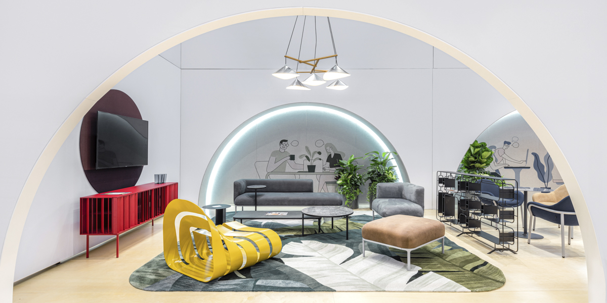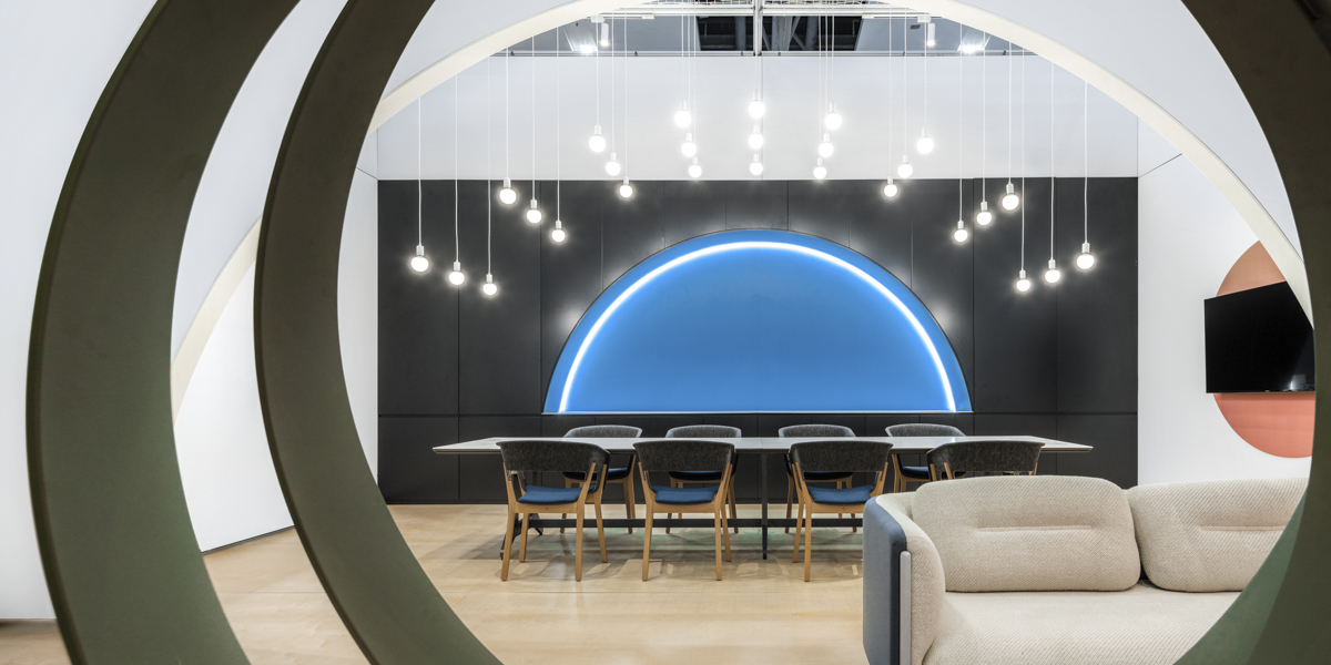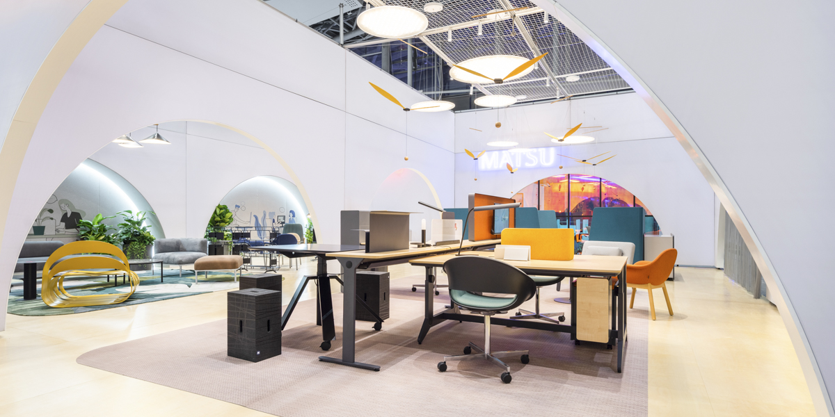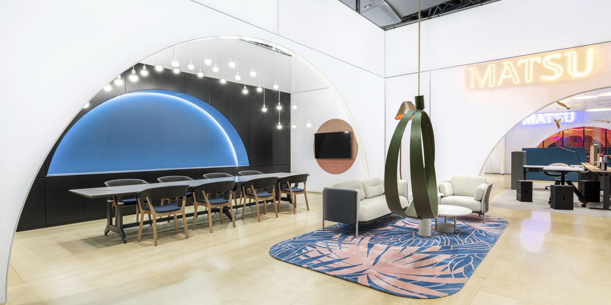 Ausgangspunkt war ein rein weißer Raumkörper, der als ruhige Bühne für MATSU’s farbenreiche Möbelkollektionen diente. Rundbögen, inspiriert von klassischer Architektur, wurden als skulpturale Rahmenelemente interpretiert und leiteten Besucher durch eine fließende Raumsequenz ohne Flure – vom Empfang über Pantry und offene Arbeitszonen bis zum Executive Office.