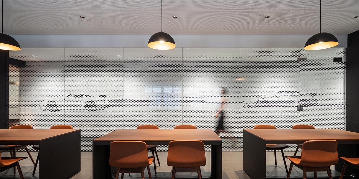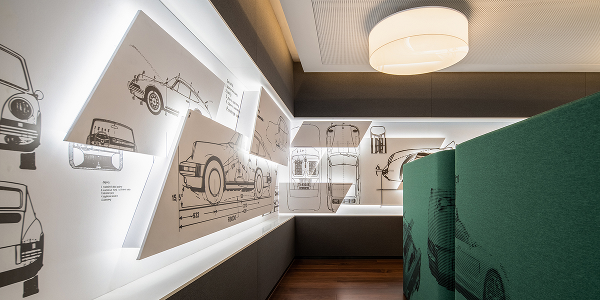 Das grafische Konzept folgt dem Leitmotiv „Ordnung in Bewegung“. Punkte, Linien und geschichtete Bildwelten bilden die visuellen Grundelemente, inspiriert von Rennstrecken, Geschwindigkeit und urbanen Landschaften. Durch variierende Dichten und gerichtete Anordnungen entsteht ein dynamischer, progressiver Rhythmus. Inhalte zu Markengeschichte, Modellentwicklung und Technologie sind dezent in Wände, Glasflächen und Präsentationsbereiche integriert.
