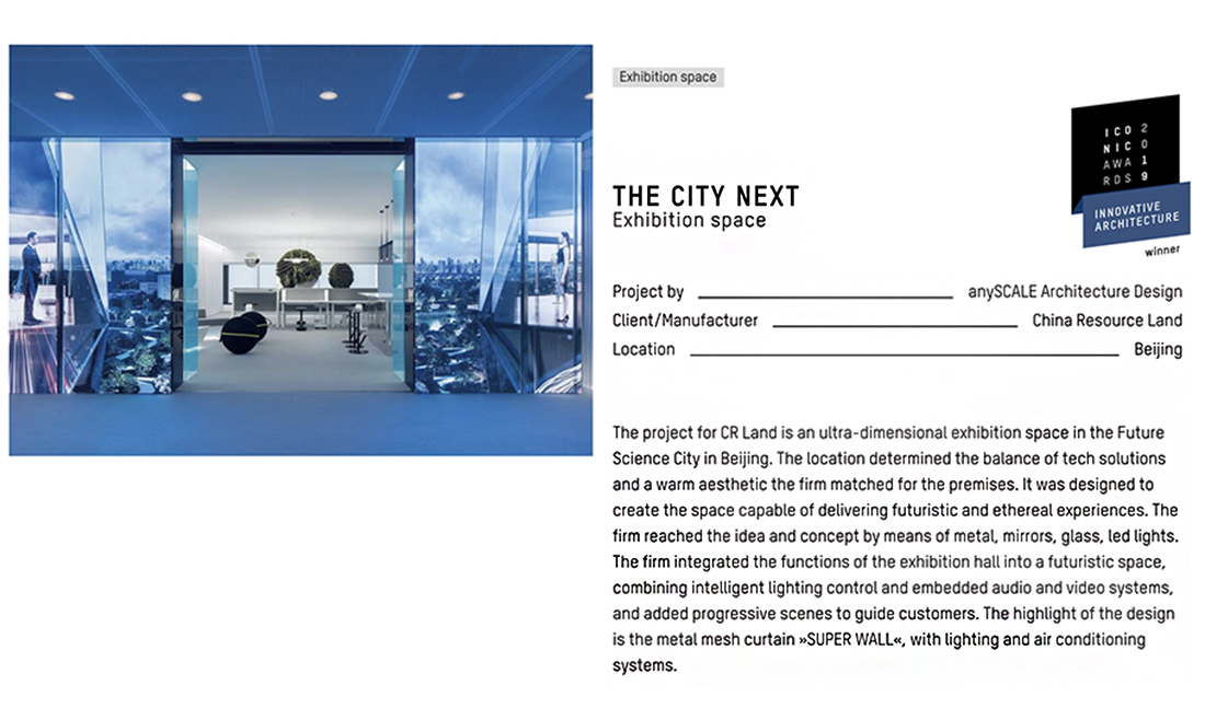 anySCALE honored twice by the German Design Council’s renowned ICONIC Award. Futuristic designed THE CITY NEXT is the winner in the “Exhibition Space” category, and Shanghai located day spa XURFACE has been selected in the “Brand Space” category.