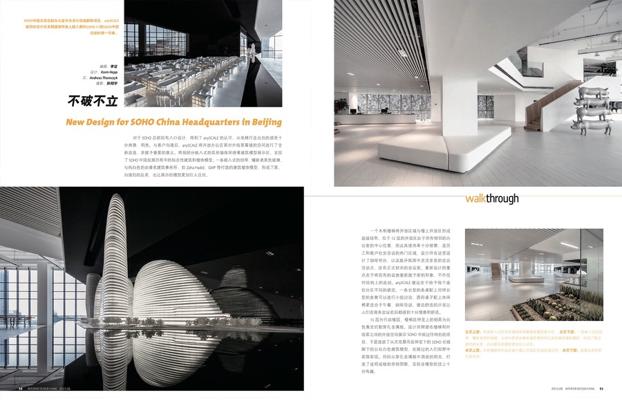 anySCALE’s project on the redesign of Chaowai SOHO was published in Interior Design China (ID China) in their September edition, 2015. As SOHO China’s Beijing headquarter office, the design included a new up-to-date exhibition space in which to display all of SOHO’s architecture models. Other works included updating meeting rooms on the executive floor. Karin Hepp was the lead designer for this project. ID China is the Chinese version of US magazine Interior Design, founded in 1932 and widely considered one of the world's top interior design magazines.