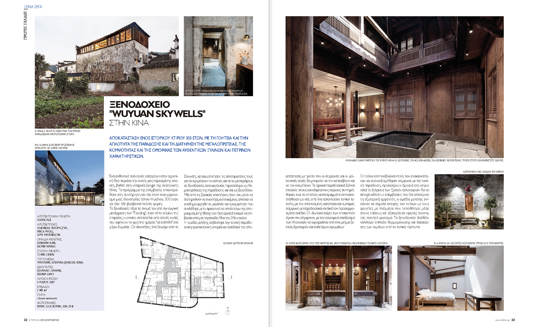 KTIRIO magazine, the first building and design magazine ever published in Greece in 1986, recently published an article featuring anySCALE’s project with Wuyuan Skywells Hotel. Located in China’s Jiangxi Province, the 300-year-old Hulzhou-style hotel tasked anySCALE with modernizing the traditional space while integrating a 21st century structural and functional elements. With help from artisans skilled in centuries-old crafts, ornate, carved timber frames and the original Qing Dynasty-era design was preserved while natural, warm colors with a pop of bold accents bring the space into the modern era.