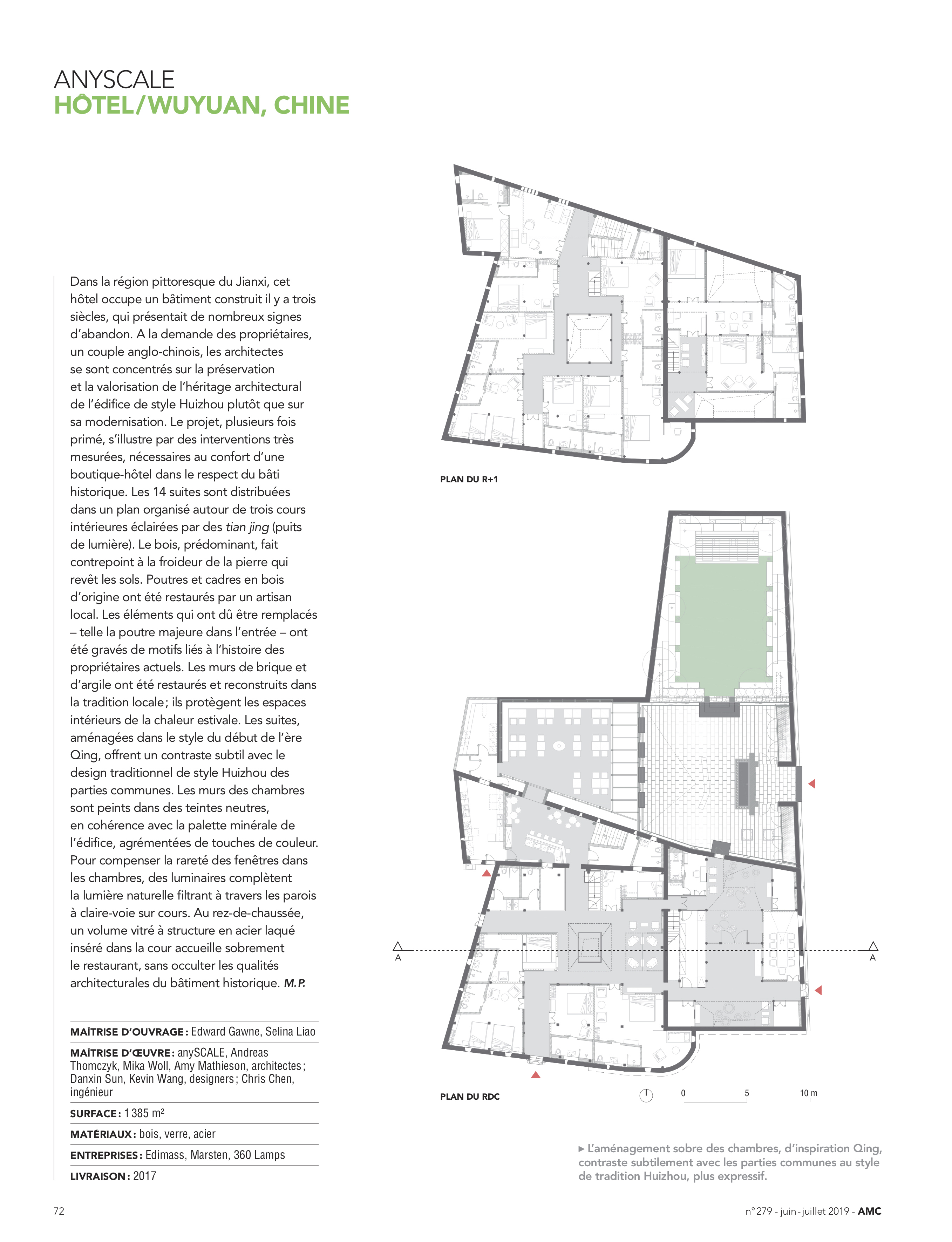anySCALE was once again given a media spotlight, this time by French publication AMC magazine in their Intérieurs 2019 edition. In this issue, AMC gives a full-page report highlighting our work on the Wuyuan Skywells, giving special attention to the stunning work done in restoring the manor to its historic glory while at the same time renovating the grounds to be livable as a modern hotel. Further details give focus to the use of neutral hues consistent with the color palette of the building and light fixtures to complement the use of natural light.