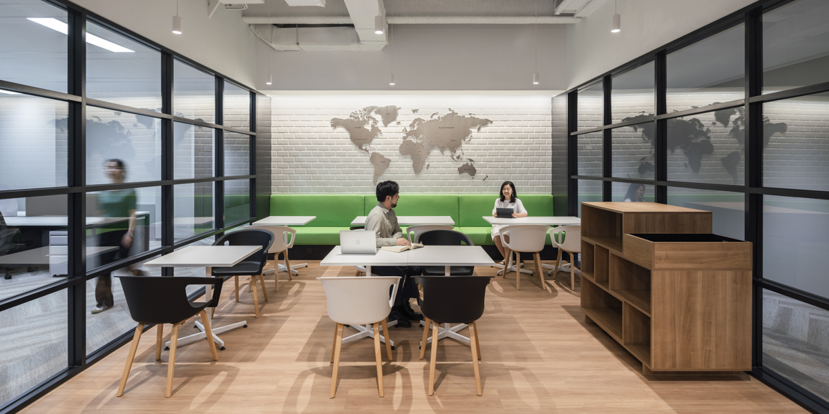 The reception area features terrazzo tile flooring with glass walls to fill the space with as much natural light as possible. Behind the vertical wooden slats, an LED screen shows movies keeping things modern, lively, and engaging. Lastly, between the circular-square corridor and the open office on the northside, the pantry includes a world map on the wall to show customers where CP Group operates worldwide.