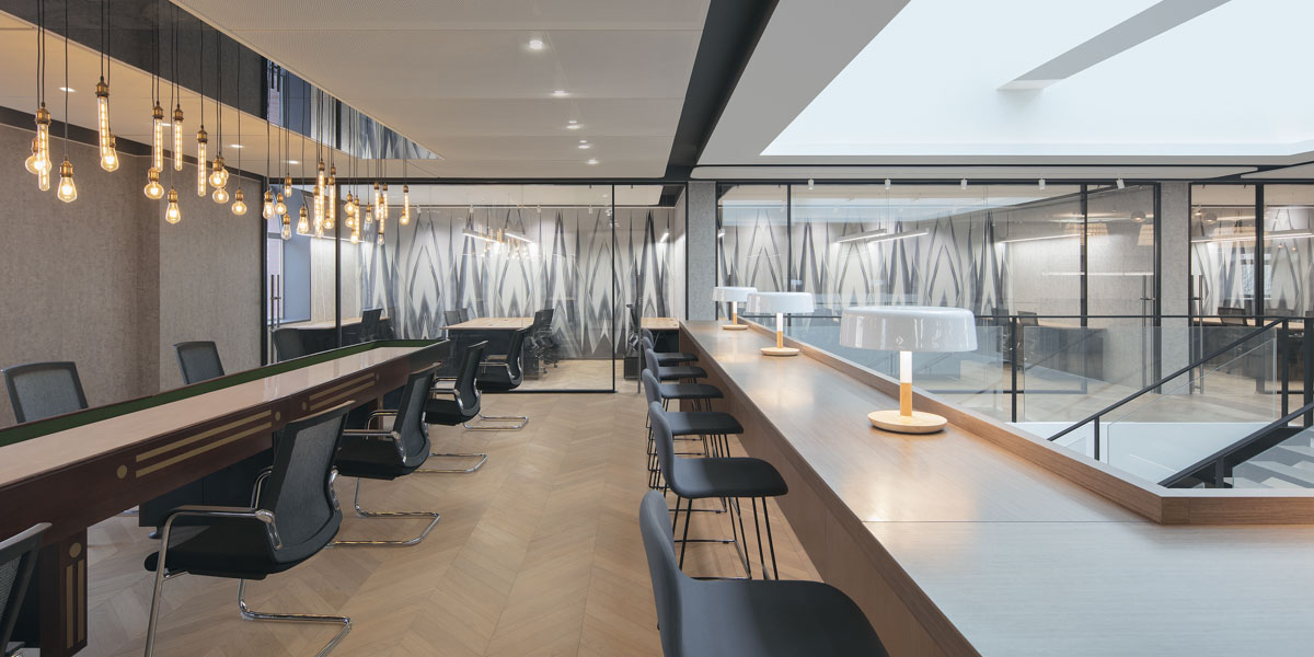 The original design had almost no external windows; so, to rectify this, part of the second floor slab was opened and a skylight constructed, allowing natural light to flow in. The areas which natural light could not reach were augmented with a wall-fitted daylight simulation device. The LED device could automatically adjust according to the position of the outdoor sun and color temperature, creating a brilliant floor-to-ceiling illumination effect.