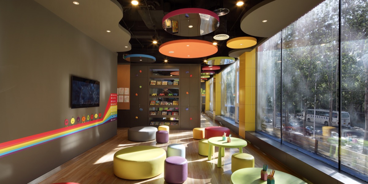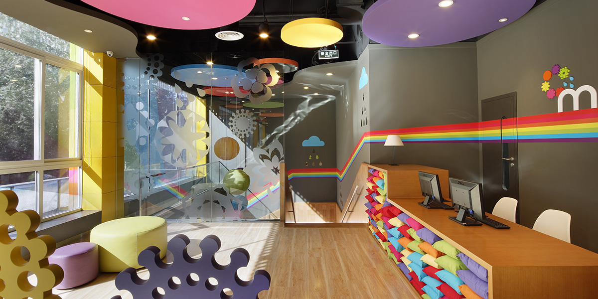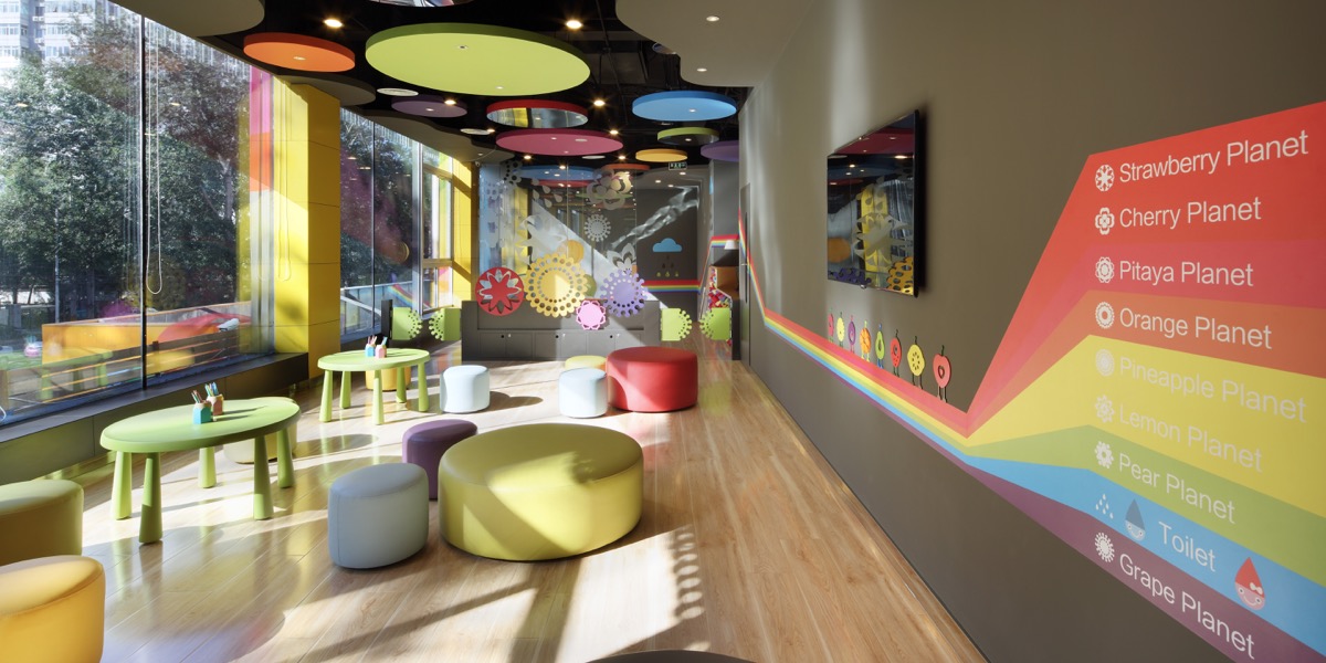 The School accepts children from the ages of 2 to 6. Use of colour as part of the design is hugely beneficial for learning at that age, making the boring classroom space come alive with interest. Using the themes of colour, travel and planets, lead project designer Tom Chan developed the design concept of “Fruit Planet”. Tom introduced the idea of travel through the use of a  special passport and stamp. Every class was a different Fruit Planet and in total there were 8 planets. Every planet adopted the colours of it’s corresponding fruit. Every child was a citizen of a Fruit Planet. All the children had badges and passports for their corresponding planet classroom. When moving up a grade, the child received another badge and passport; and he/she would graduate once all 8 had been collected. This teaching idea was entirely consistent with the design of the space, completely overturning the former teaching model. “Rainbow Bridge”- bright rainbow lines painted on the walls - created a pathway that connects the Earth to the Fruit Planets. Like a way-finder, each colour of the rainbow leads to a different classroom.