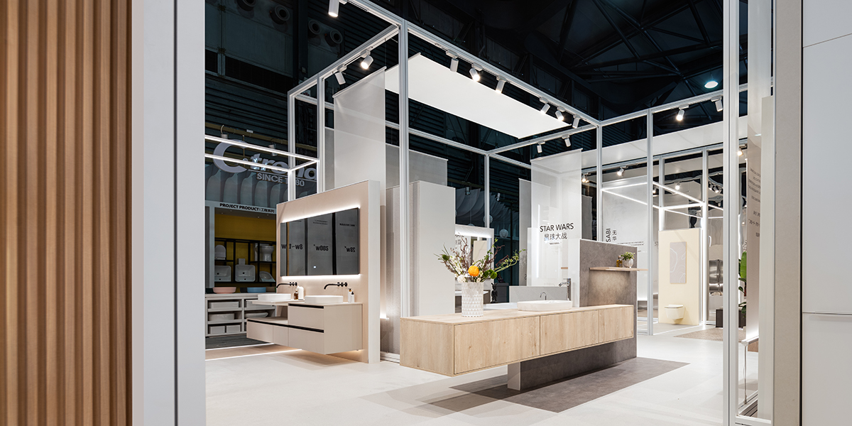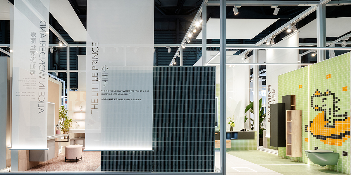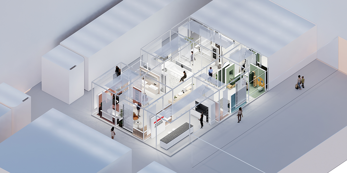 En una superficie de 170 metros cuadrados, el stand presenta ocho escenas de baño distintas, cada una pensada para un perfil de usuario imaginado: desde una líder dinámica hasta un amante contemplativo del Wabi-Sabi, pasando por situaciones familiares juguetonas para niños. Concebido como una estructura abierta y modular de perfiles metálicos cuadrados, el stand se percibe como una retícula generosa y permeable.