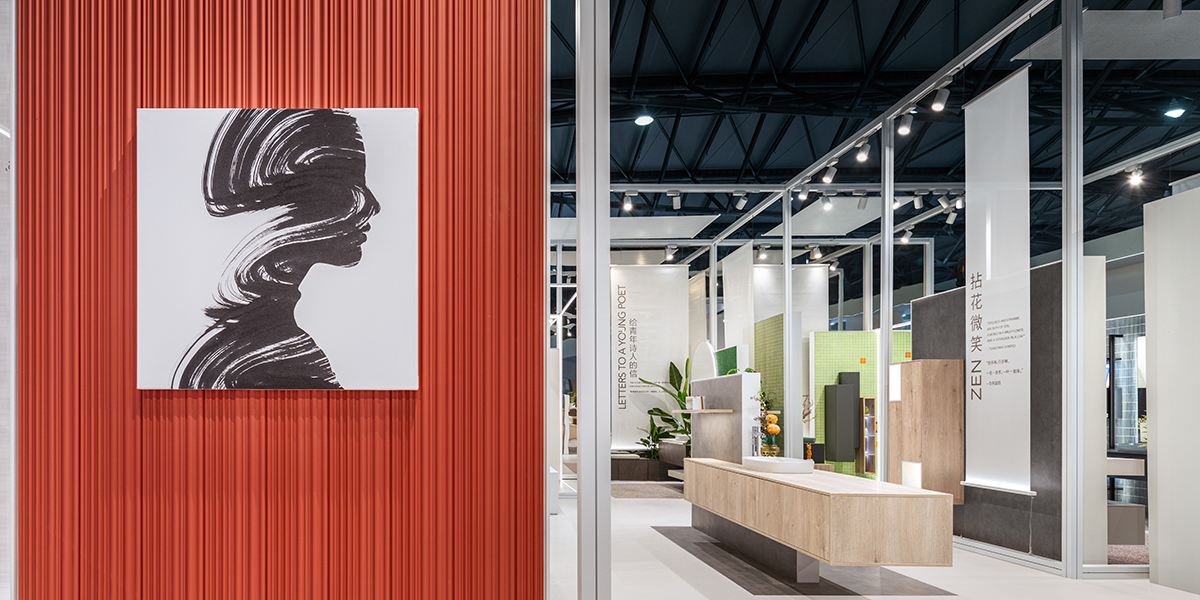 La composición casi collage de los paramentos se unifica mediante una capa de tejido tensado en el interior de los marcos. Esta “piel” textil actúa como filtro visual: separa suavemente el stand del entorno ferial y, al mismo tiempo, permite fugaces destellos del interior, despertando la curiosidad e invitando a explorar.