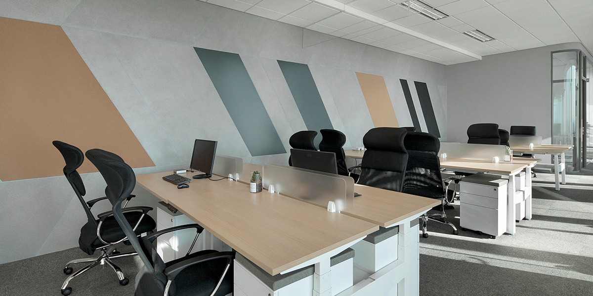 Neutral grey tones dominate a majority of the office, with stylish concrete finishing, handsome wood furniture and sleek glass partitions being the other design highlights. Smart adjustable desks set in the open working space near the windows can be adjusted as needed and facilitate mixed-use of the area. The flooring for the lobby and shared space uses light-toned wood panels that bounce natural light around the office, complementing the contemporary chic design with a bright and pleasant airiness.
