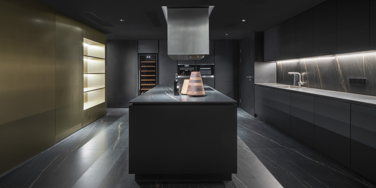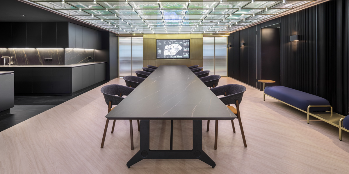 The showroom's heart is a communal area that includes a large living room table and a kitchen niche to the side. This space serves as a 'social hub' for the Shenzhen design scene, which can host a wide variety of events. To compensate for the low ceiling height in this area, the team developed a modular tinted glass ceiling with integrated lighting for an airy, summery atmosphere or even a starlit sky depending on the type of occasion.