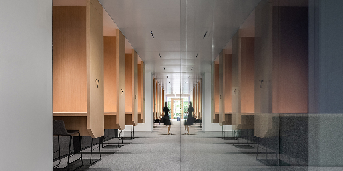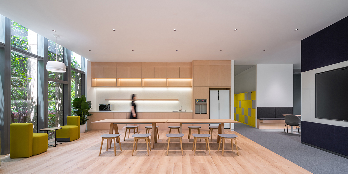 A diferencia de las oficinas corporativas tradicionales en China, el diseño apuesta por la apertura y la fluidez espacial. Paneles bajos y muebles laterales estructuran el espacio con sutileza, mientras los ventanales de suelo a techo en la fachada sur inundan el comedor de luz natural. Butacas tipo lounge, mesas altas y cabinas amarillas aportan color y vitalidad, complementadas por nichos de madera que ofrecen tranquilidad e intimidad.