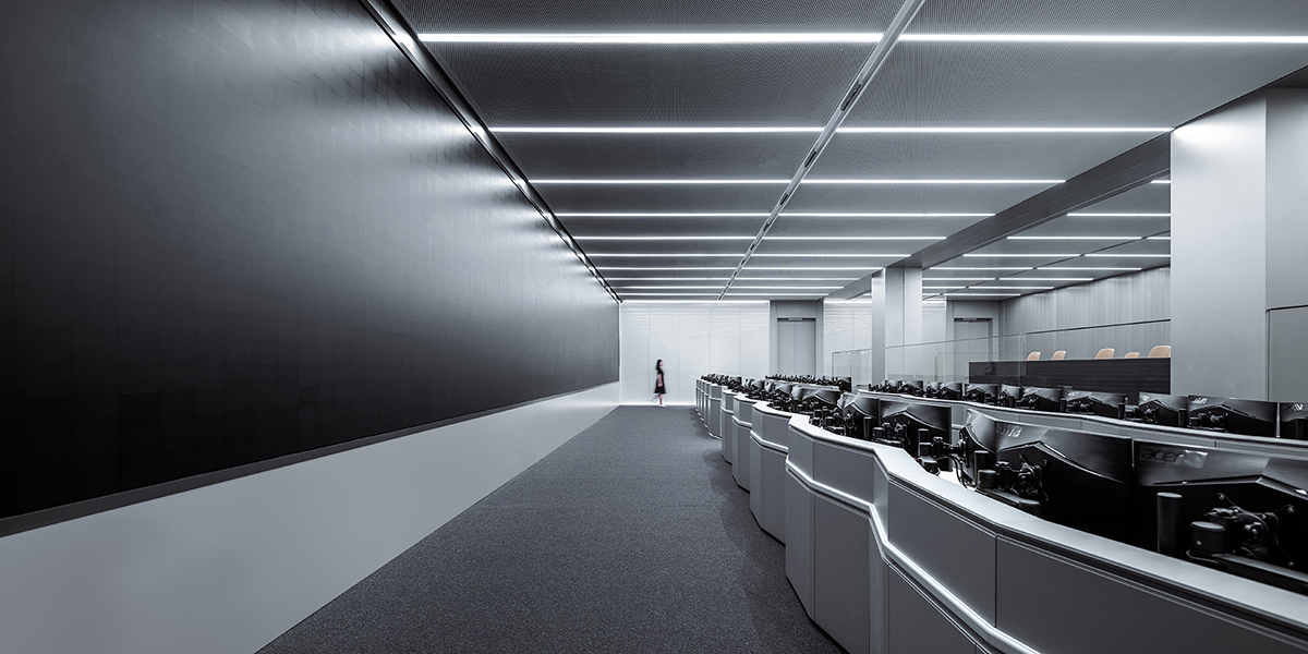En el centro se encuentra la sala de mando, presidida por una pantalla digital monumental que recorre toda la longitud del espacio. Filas de puestos de trabajo inclinados se orientan hacia ella, flanqueadas por una plataforma de observación elevada de vidrio. Con su paleta de tonos metálicos, negros y grises, el ambiente combina precisión tecnológica y elegancia futurista.