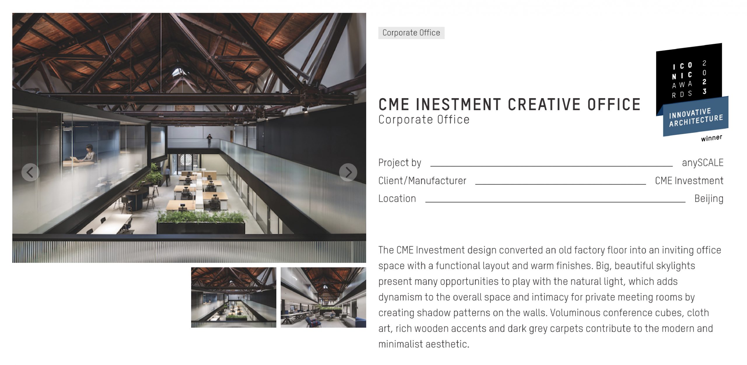 We are delighted to announce anySCALE has won four Iconic Design Awards 2023 for Innovative Architecture. Our distinct designs for the CME Investment Creative Office and the Nobilia House @CIFF Shanghai claimed victories in the Corporate and Retail Interiors categories respectively.
