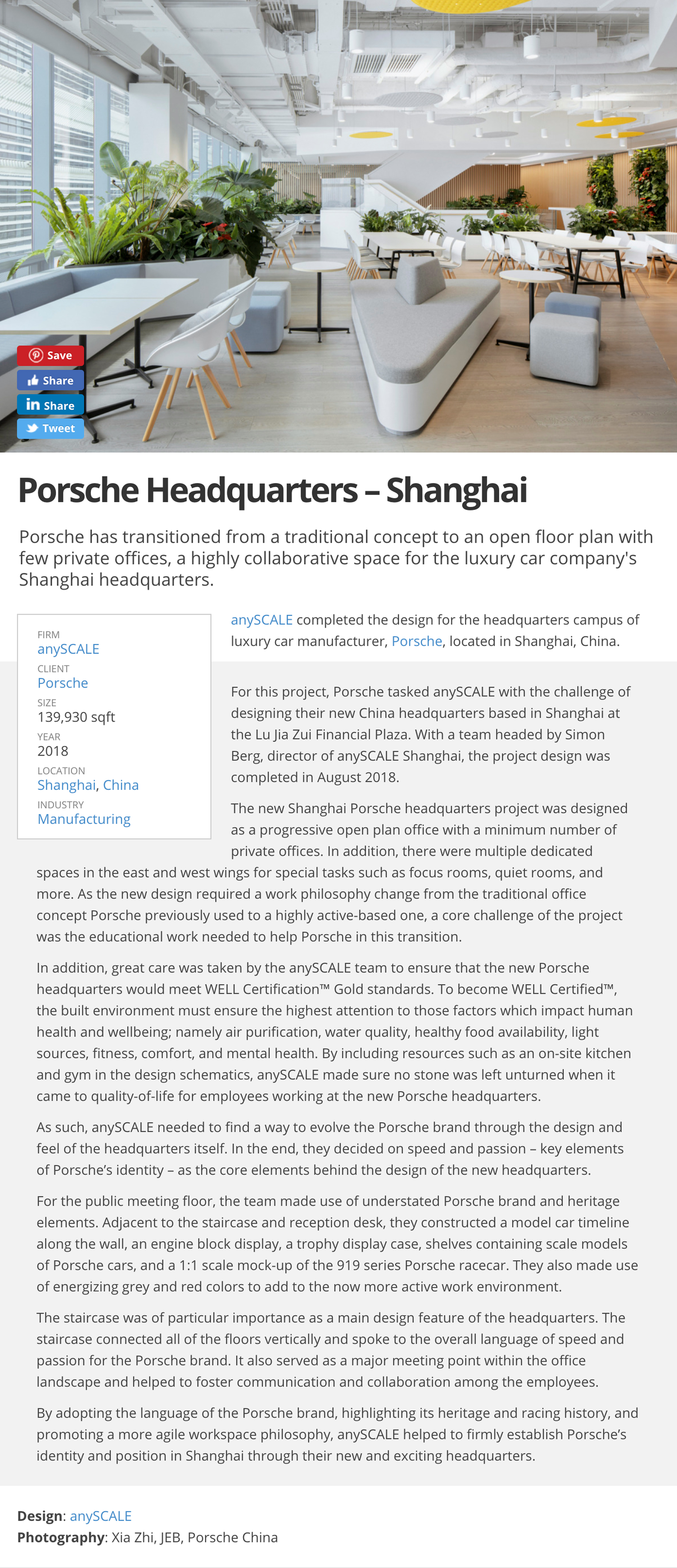 Office Snapshots, a leading online resource for the global office design community, has published an article featuring our work in Porsche’s Shanghai headquarters. The article describes anySCALE’s use of a progressive open office plan and forward-thinking design elements used to meet WELL Certification Gold Standards as helping to firmly establish Porsche’s identity and position in Shanghai.