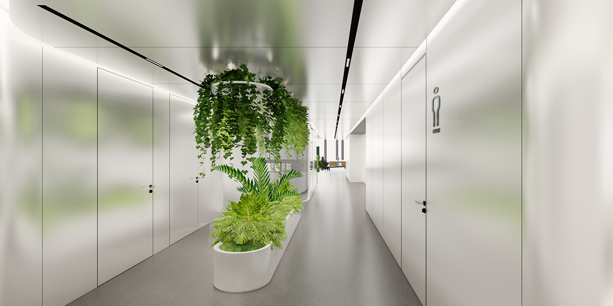 The design introduces a calm, contemporary atmosphere through a palette of soft white base tones complemented by natural greenery and materials in subtle shades of green. Together they create a welcoming environment that sets a fresh and modern tone for the headquarters’ entrance zones.