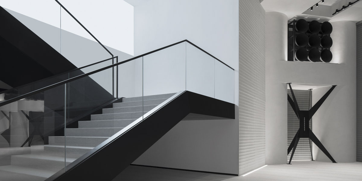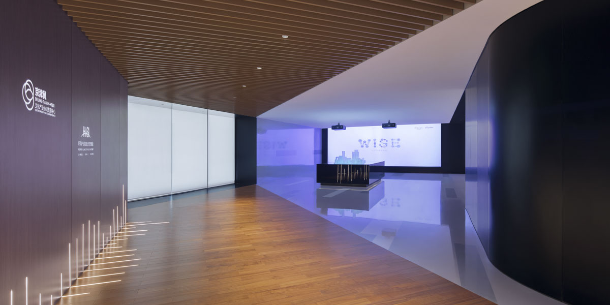 在这个项目中,我们将声波以可视化的数码形态出现,转化为连续波动的灯光阵列,出现在地面以及墙面的转角位置,黑白和深色木饰面营造出稳健又现代的展示空间主色调。