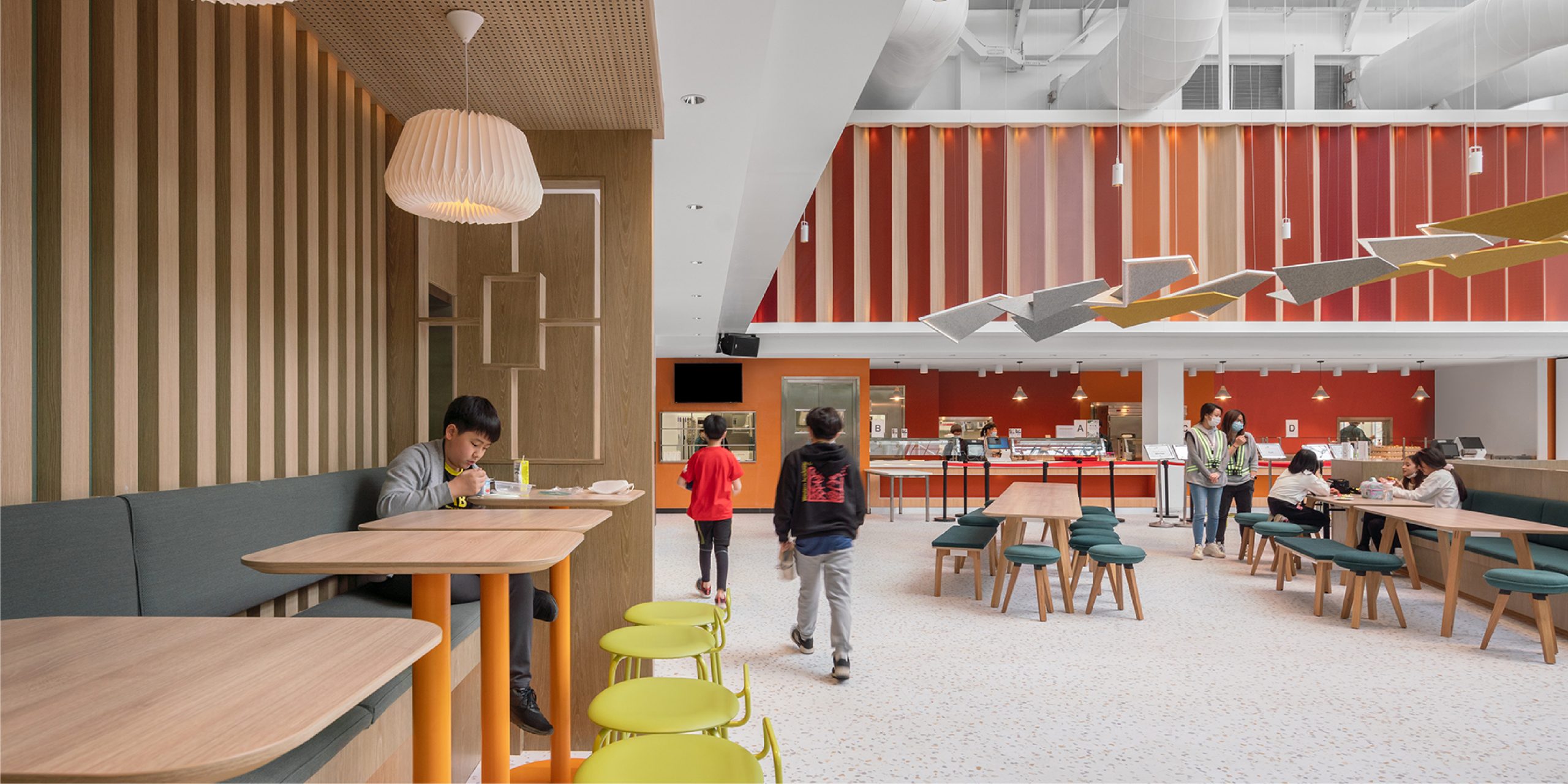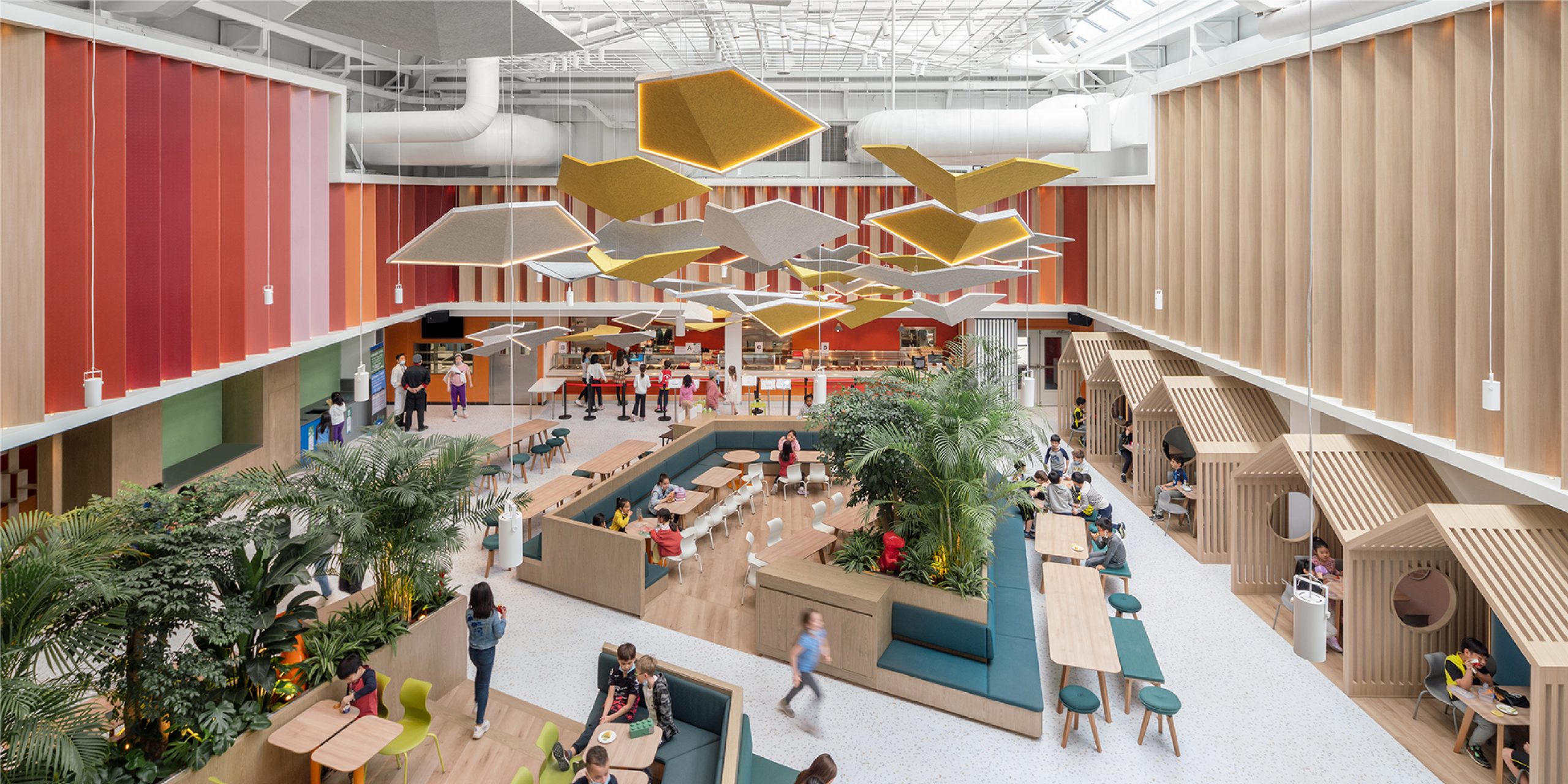 The overall space can seat upwards of around 300 students, and each island can seat up to approximately 40 children. Most importantly, the islands are designed as enclosures, providing a sense of comfort and protection for younger students. One of the islands is dedicated to kindergarteners exclusively with custom-made small furniture pieces.
