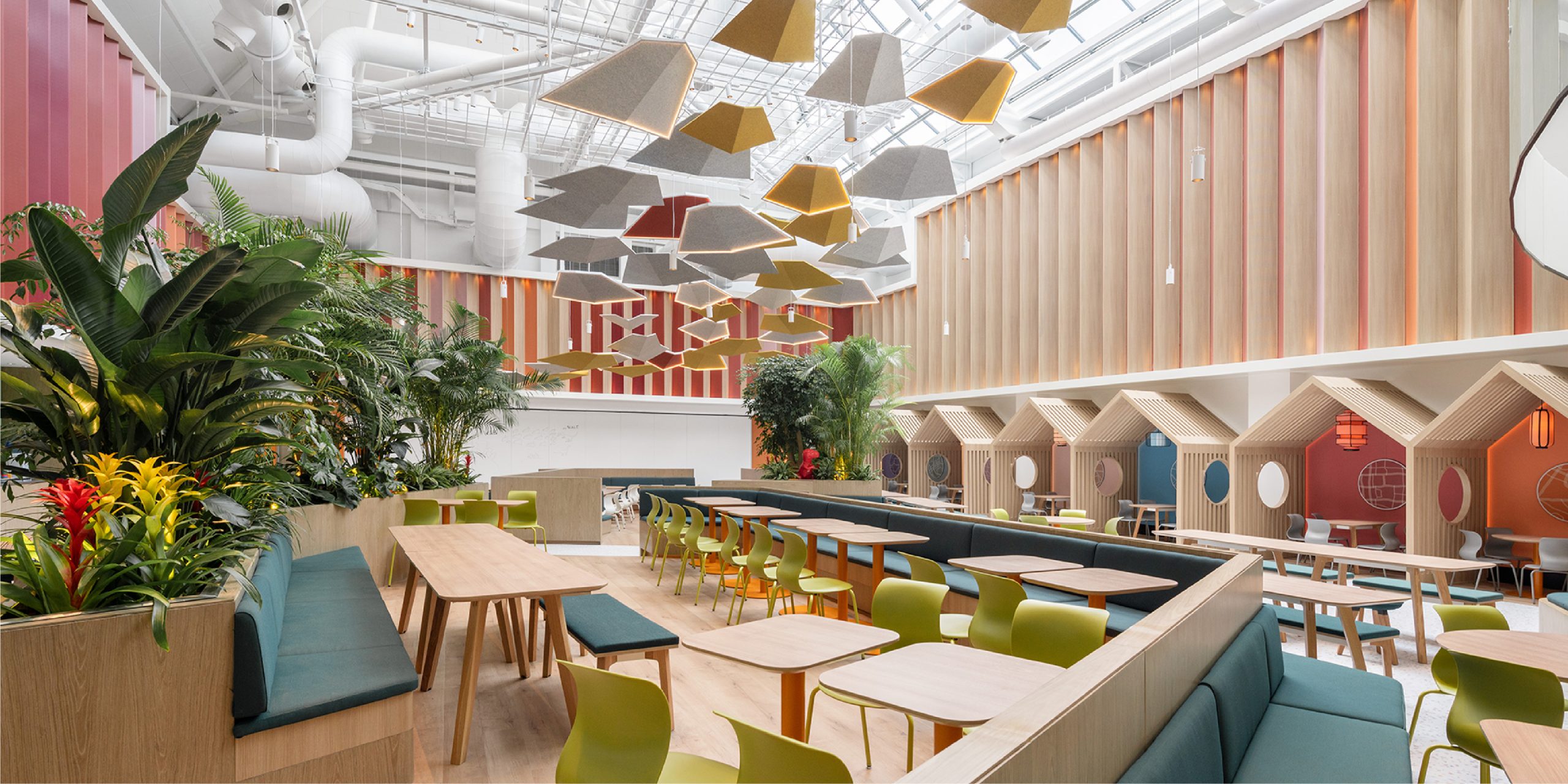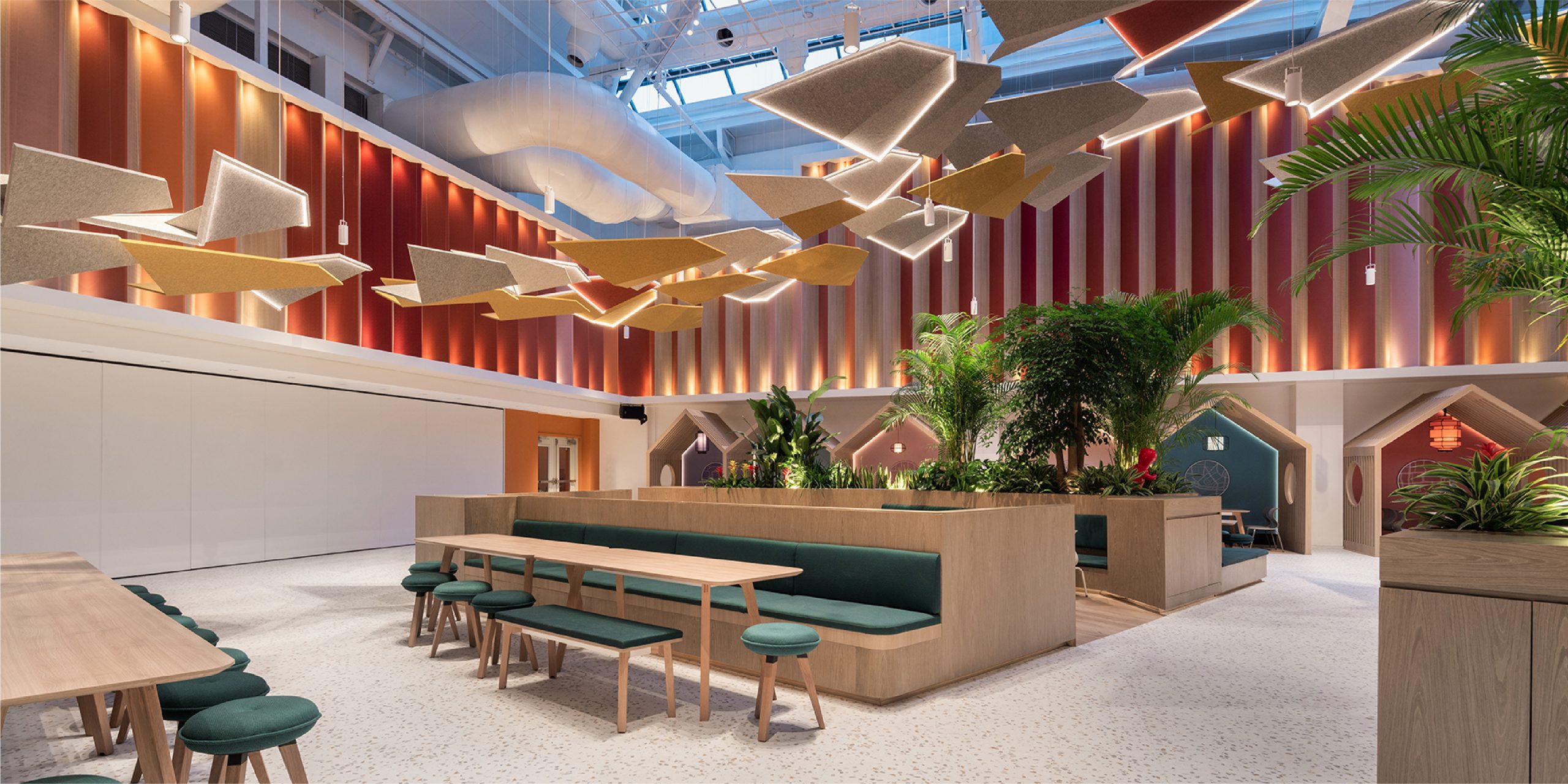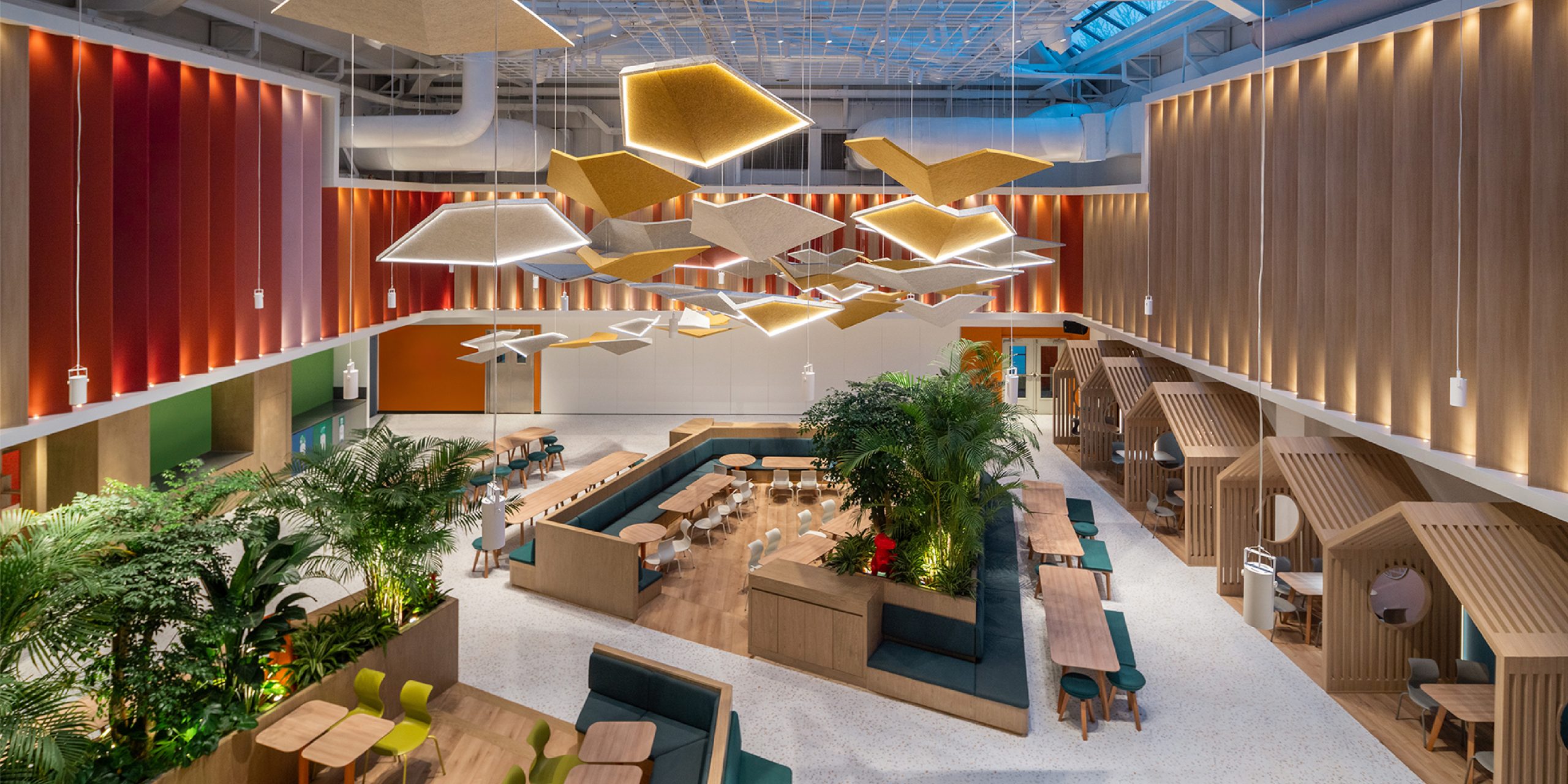Not only were we instrumental in the look and functionality of the space, but we were also responsible for its warm lighting and sound conditioning. Alongside the new zig-zag paneling, a flock of birds imitates flight rising toward the second floor, doubling as a light and sound dampening feature.