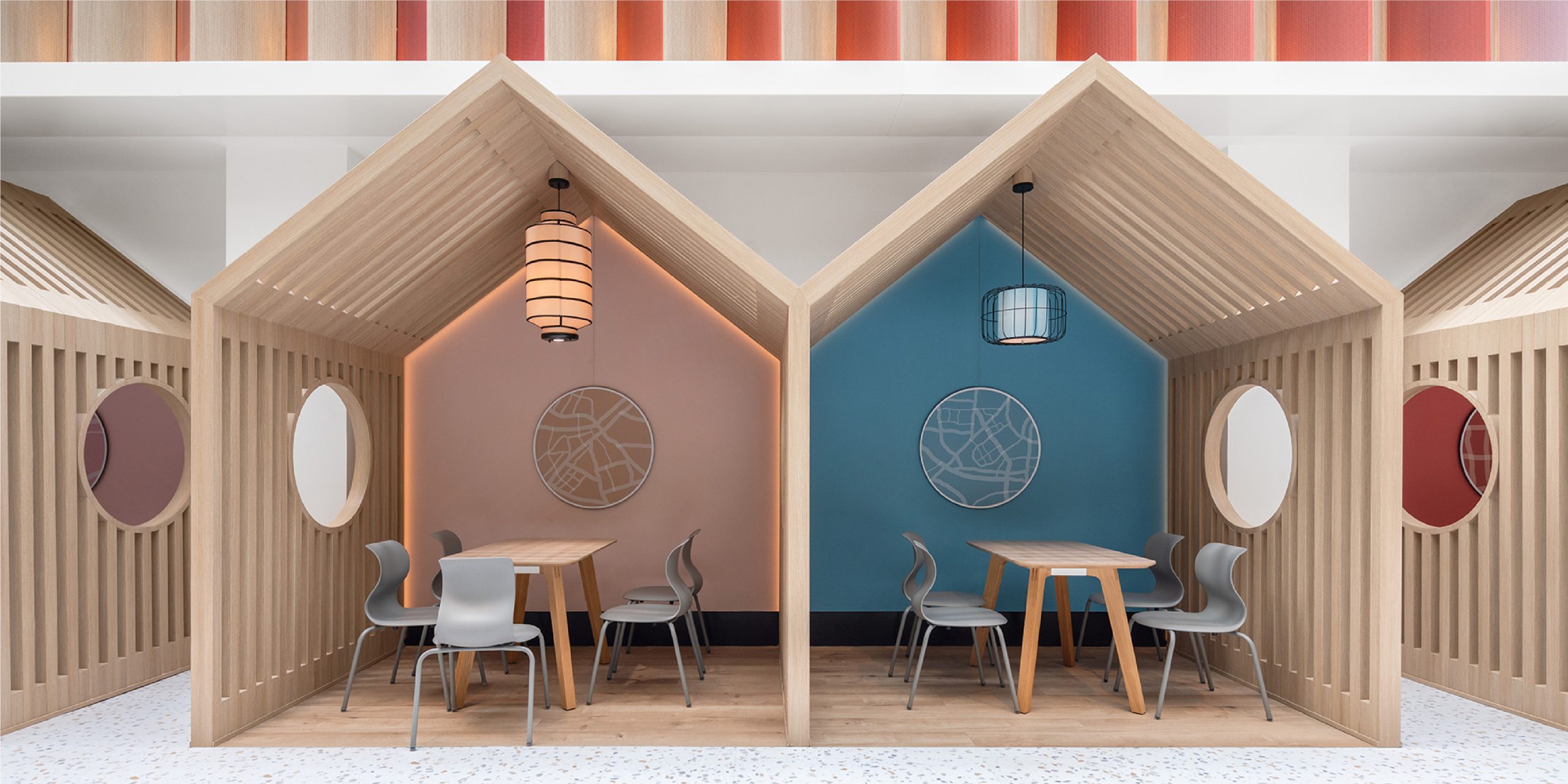 A jungle-style borde of plants is home to small dinosaur ceramics, and the writable whiteboard doors can be used for presentations or opened to reveal the kitchen. Finally, our renovations incorporate imagery from WAB's host city and country – Beijing, China – with a red-gold color palette inspired by the Forbidden City.