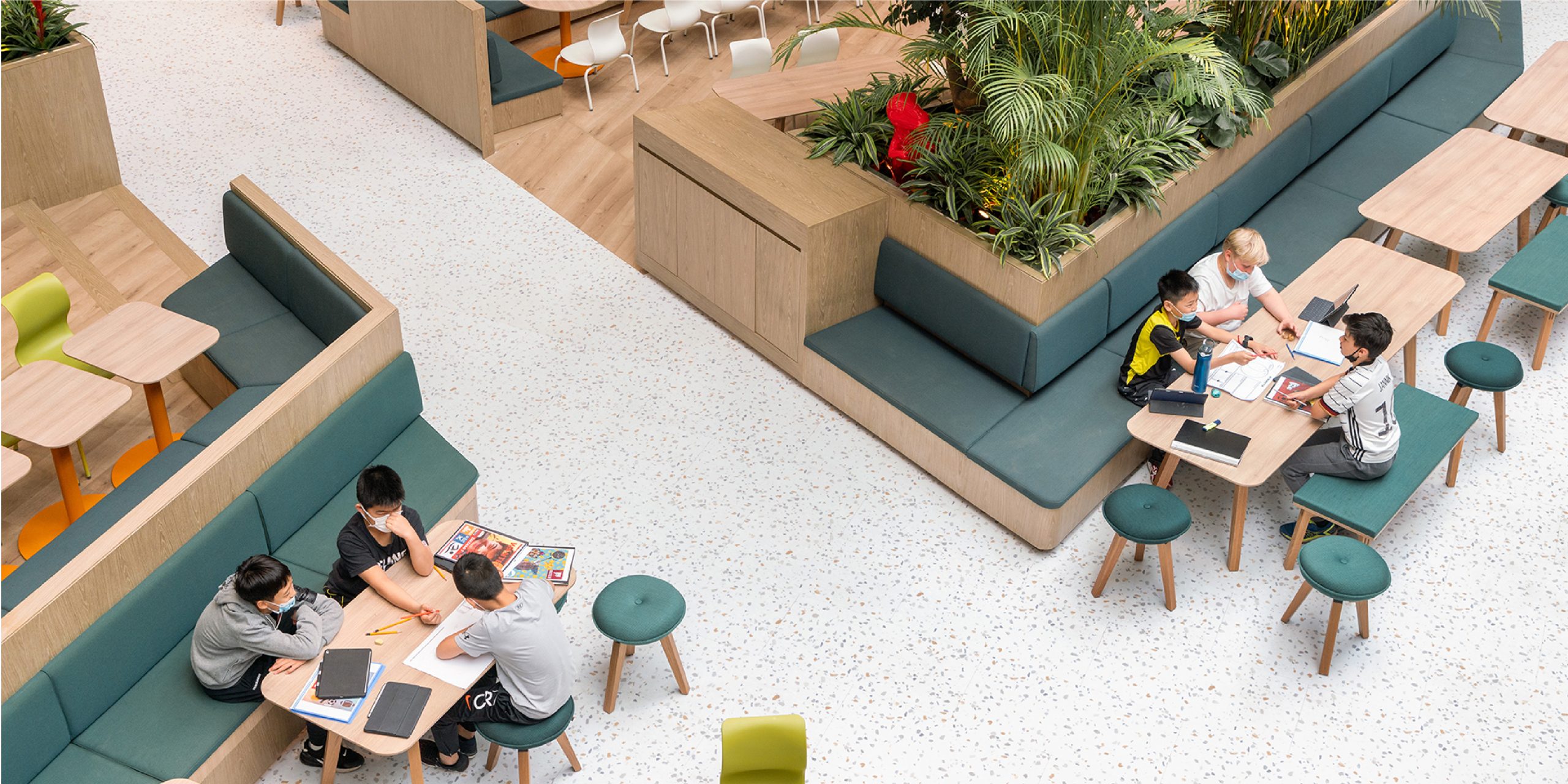 Students can choose to sit among seating styles from dining tables to bar stool nooks and small house enclosures. As a K-12 educational institution, the different seating options reflect the range in size to suit various age groups. By installing two large island sections at the center of the space, we created two natural zones, the borders of which house additional benches.