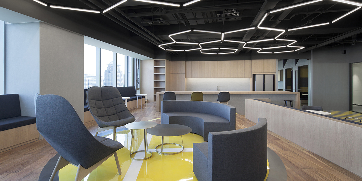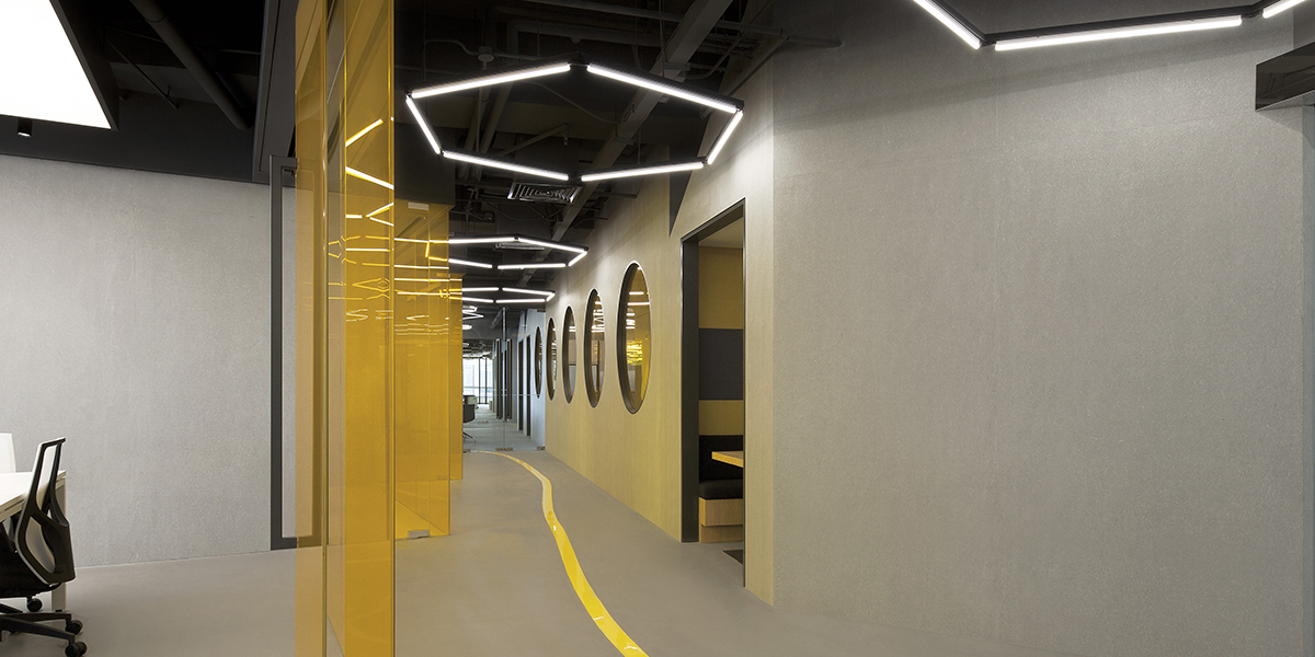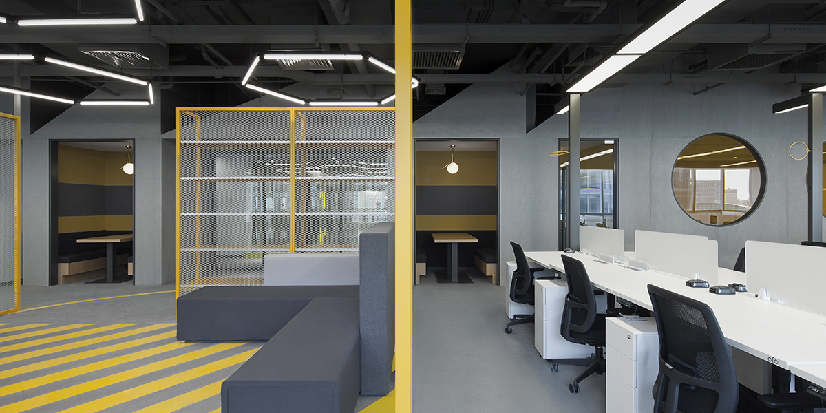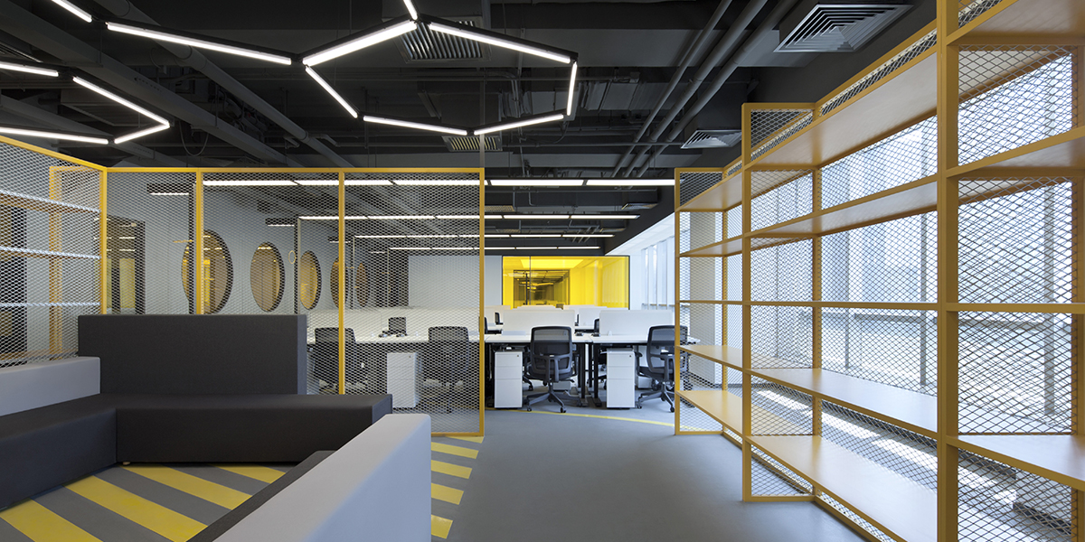 混凝土自流平地面的极简主义风格被强烈并带有冲突感的黄色图案及线条所打破,仿佛马路上一道道的交通警示线般栩栩如生。以黑白灰作为设计的主题色外,作为公司品牌色的黄色亦被广泛的运用在整个办公空间的不同区域,黄色储物架、金属框及夹胶玻璃贴膜等;不仅为办公环境增添了一抹活力与生机,亦将企业本身乐观活泼、充满激情的文化精神潜移默化的渗入至其办公环境中,浑然天成,不言而喻。