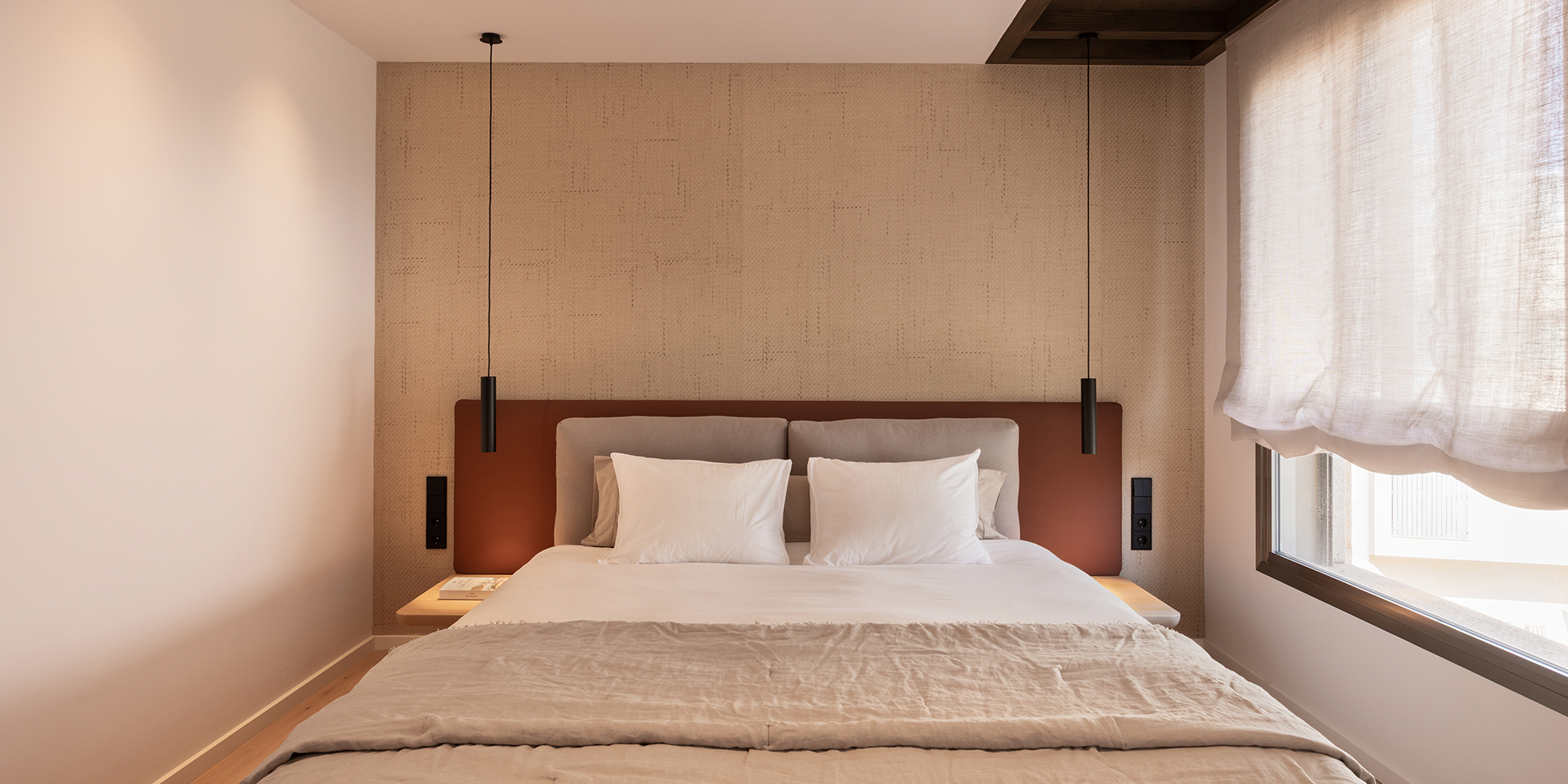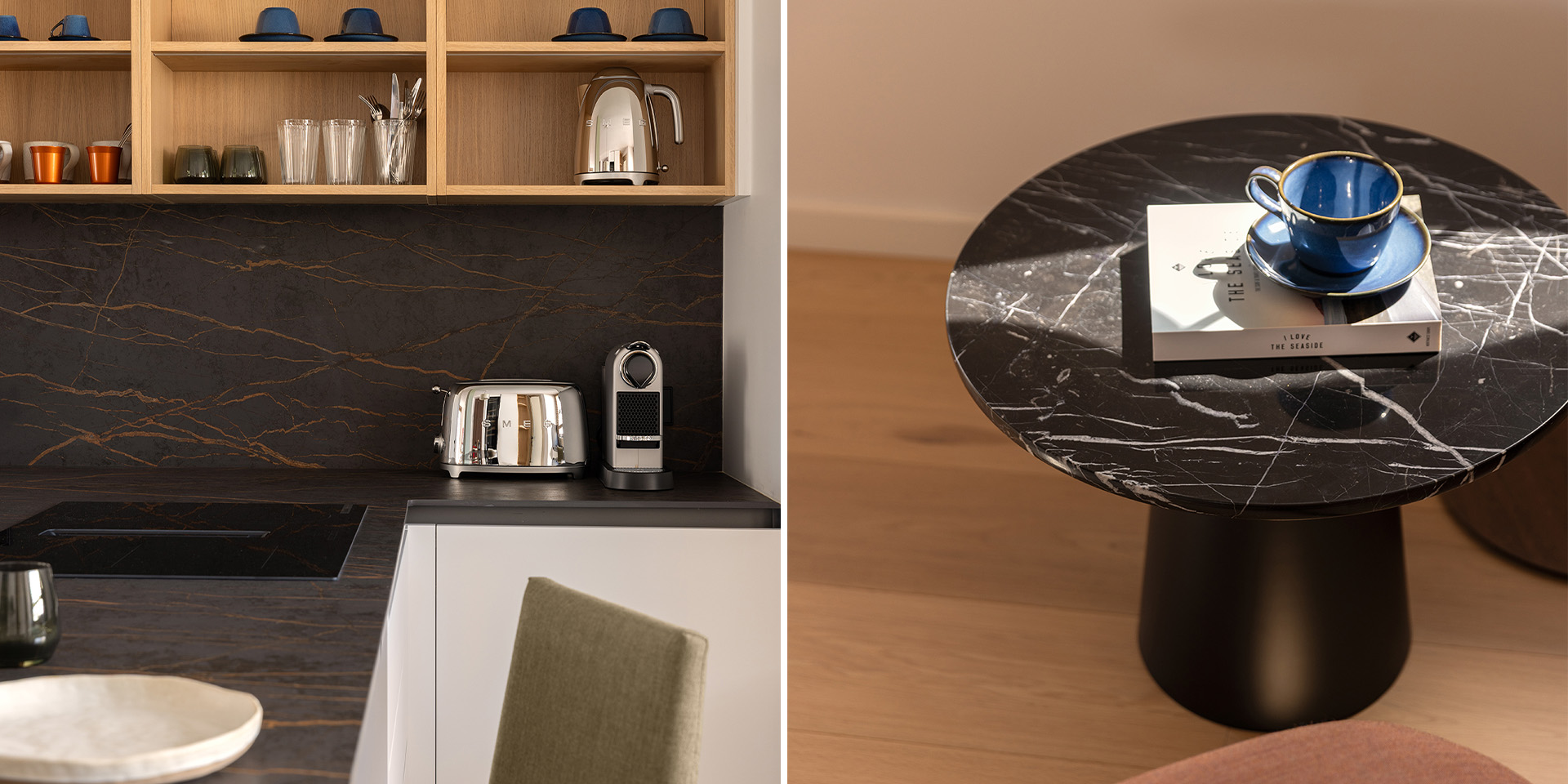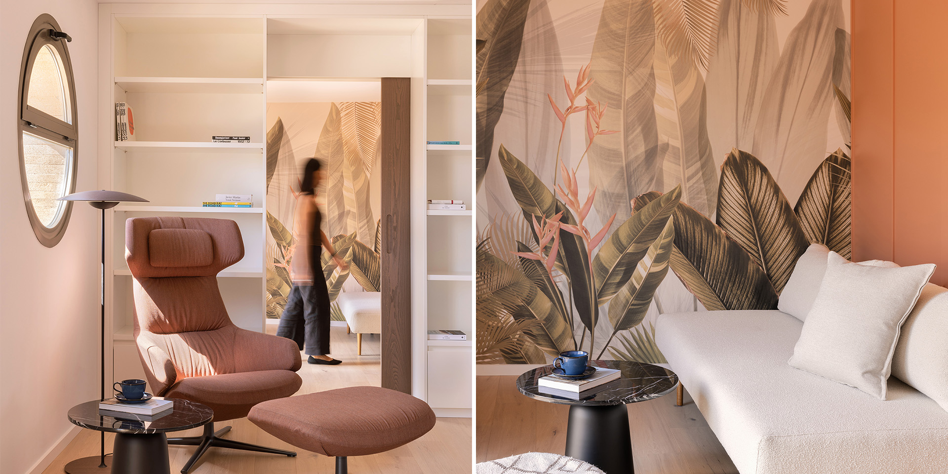 Special emphasis was placed on lighting: recessed, dimmable downlights combined with elegant decorative luminaires from Spanish brand Marset create a warm and inviting atmosphere, both day and night. Design accents include a tropical wallpaper, a walk-in closet in soft salmon tones, and an exquisite black engineered stone with golden veining featured in the open kitchen. All furniture pieces were sourced from Spanish manufacturers, chosen for their craftsmanship, quality, and understated elegance.