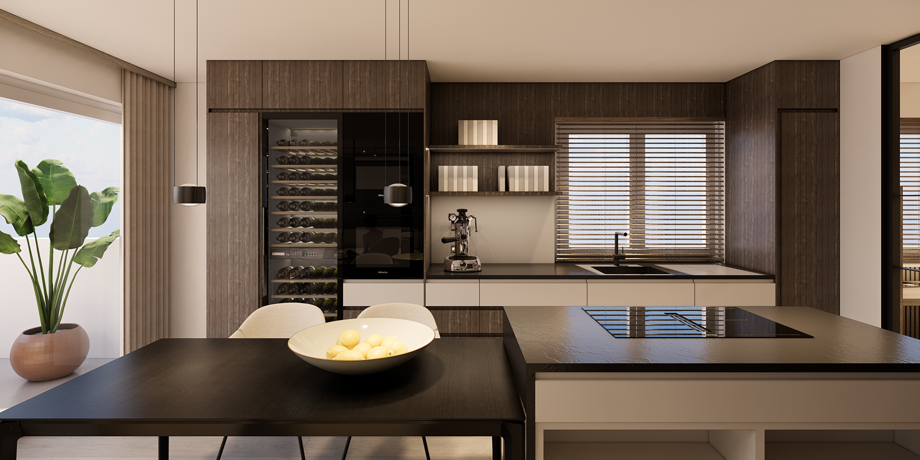 The entrance is defined by a modulated built-in furniture wall that wraps around the guest bathroom and guides the flow toward the main living area. The open kitchen is complemented by an integrated dining table facing the loggia, while an adjacent studio offers space for remote work. This arrangement allows for fluid communication across all open zones while maintaining a clear sense of separation and purpose within each area — the same principle applied to the master bedroom and its en suite bathroom.