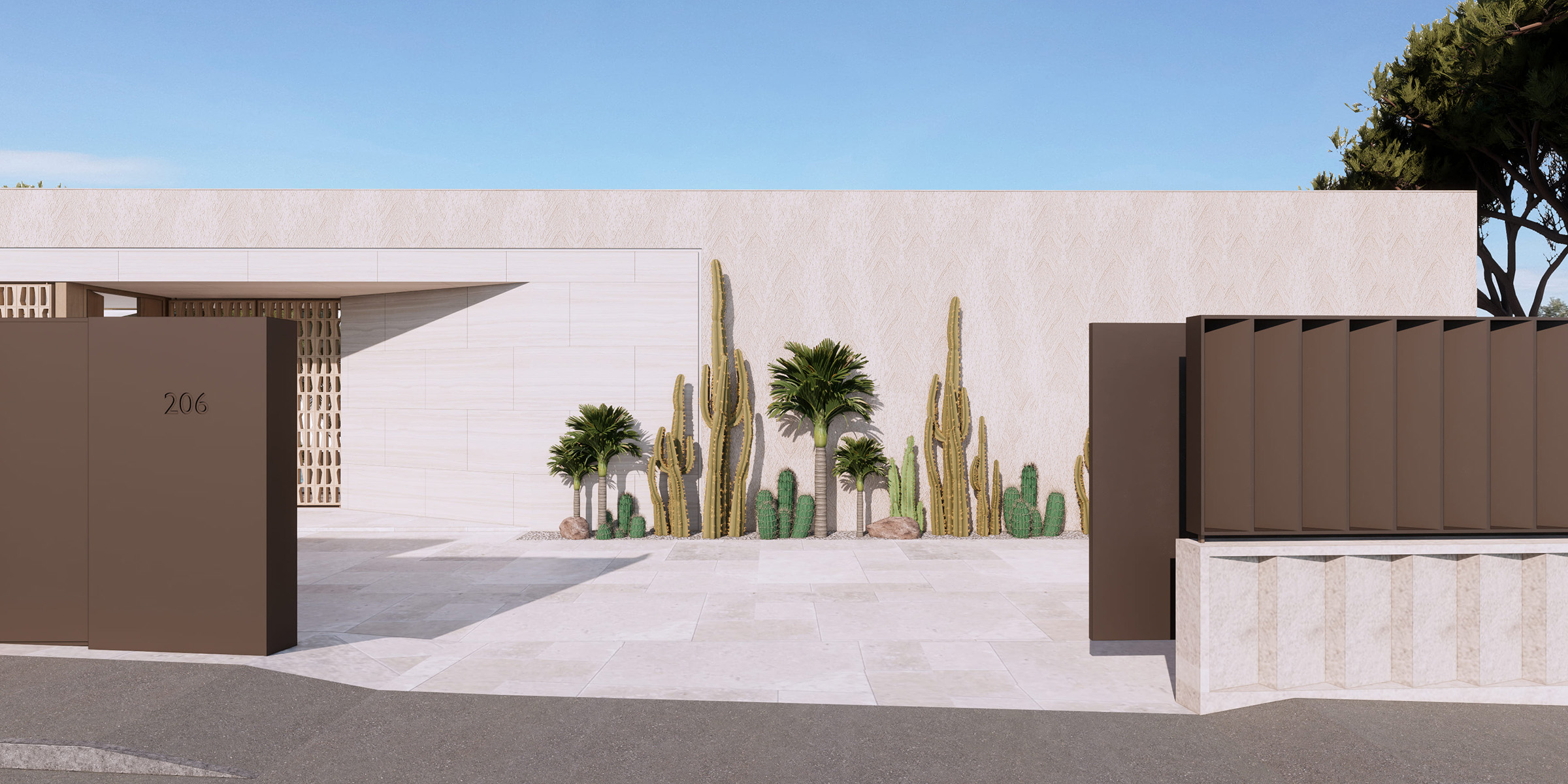With carefully curated openings—each framing a specific function and view—the architecture assumes the presence of a sculptural stone form, anchored into the hillside. Subtle travertine frames accentuate each aperture, lending refinement and precision to the cubic volume, while a sand-toned plaster finish gives the structure a discreet yet powerful sense of place.
