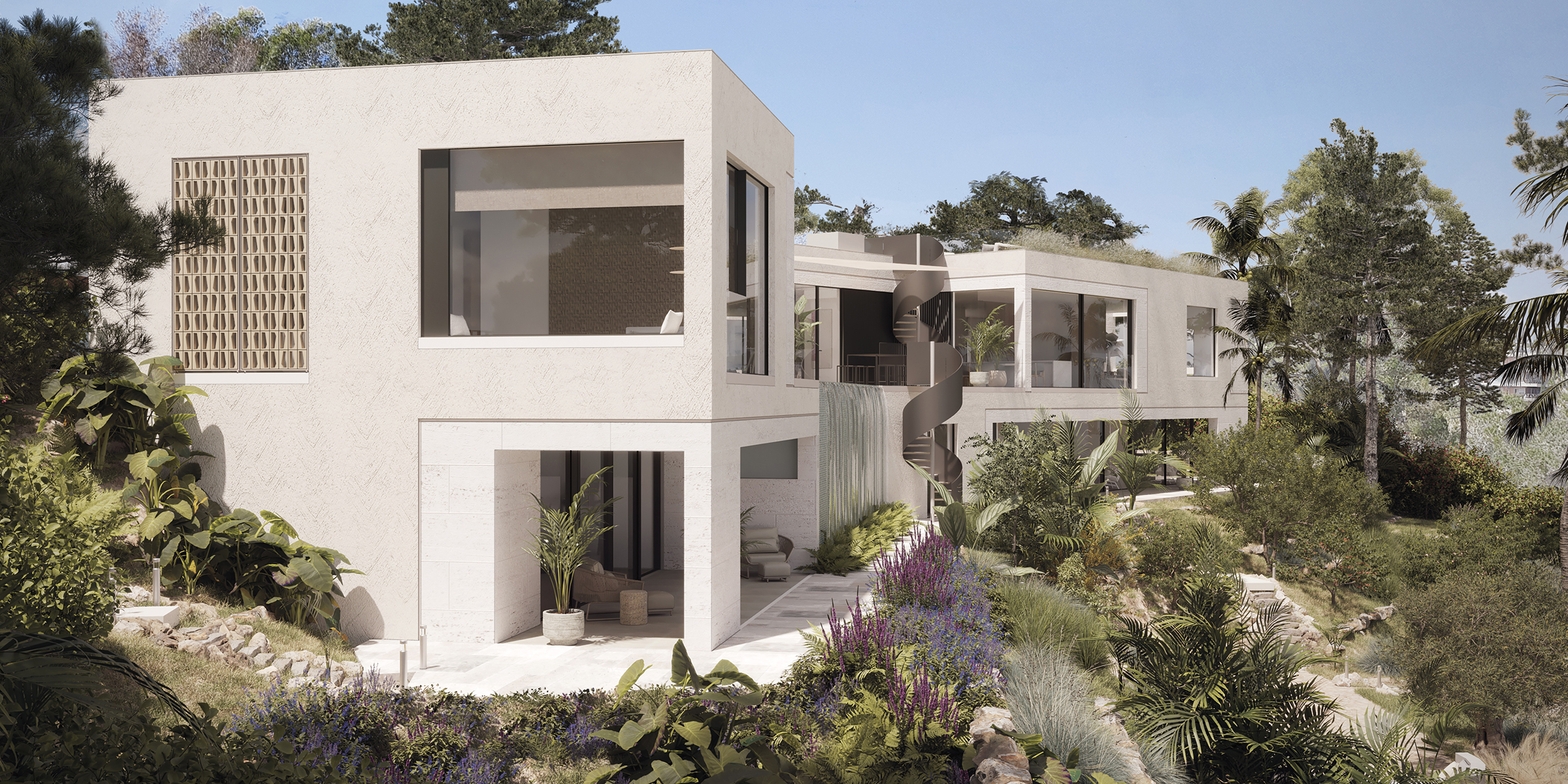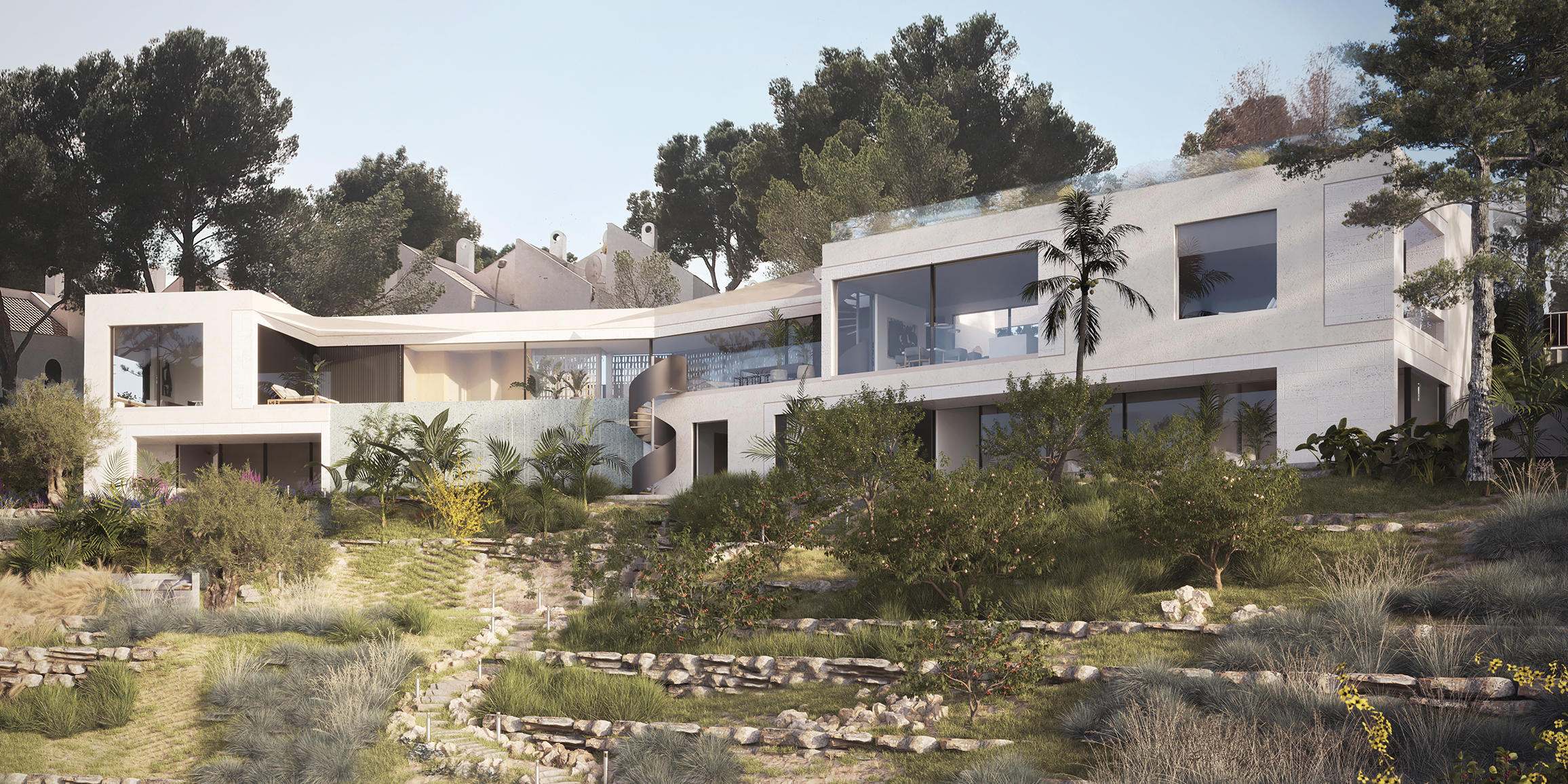 Set in an elegant and tranquil neighborhood just 15 minutes from Palma de Mallorca and close to the Mediterranean Sea, this plot offers an exceptional opportunity for a distinctive villa project. While its steep topography and north-facing orientation presented certain design challenges, these very conditions inspired a creative architectural response that makes full use of the site’s unique character.