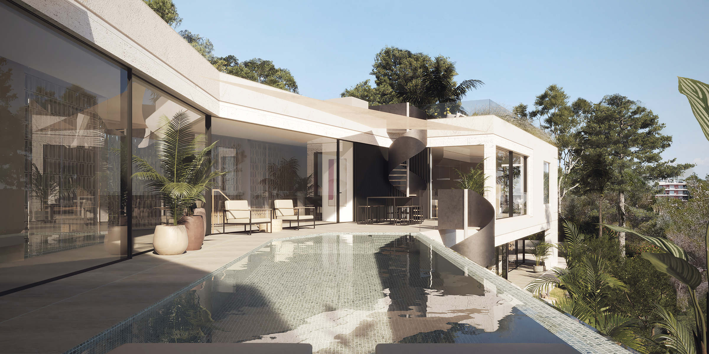 Our strategy was to elevate the house in a long, slender form along the highest possible building line, parallel to the street. This approach allowed all functions to be positioned as high as possible relative to the road, ensuring that every space enjoys both garden access and sea views. A particular design focus was the integration of the outdoor pool into the flow of the shared living spaces: rather than being set apart at the far end of the garden, it becomes an essential element of the main floor.
