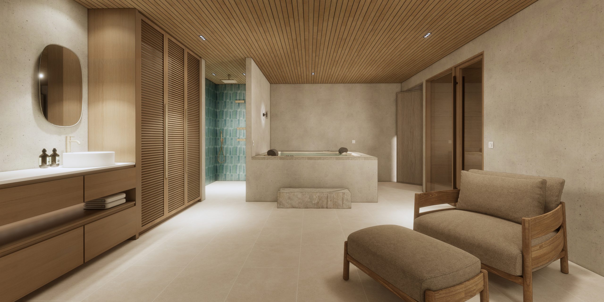Within the existing framework, we reorganized the family spaces to be both functional and generous, creating a more open connection between the interior and the garden. The formerly dark basement was reimagined as a spa, while part of the horse stables was converted into a fitness area with adjoining guest facilities. The bedrooms retained their original size and location but were enhanced with full-height windows to bring in more daylight and a greater sense of openness.