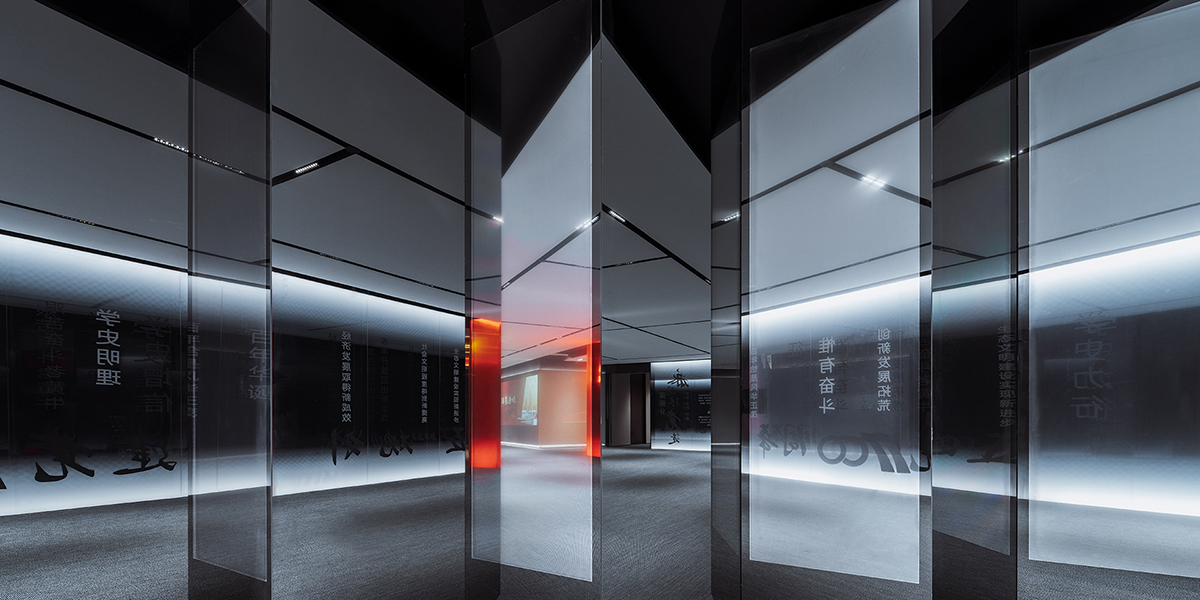 Across the showroom, dynamic media surfaces—LED walls, frameless projections, and translucent printed glass—merge technology with symbolism. The interplay of reflection and depth evokes both memory and progress.
