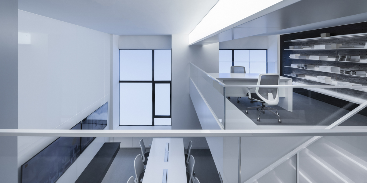 A minimalist ceiling design with artificial skylights provides warm "natural" white light, which works in tandem with the RGB-based color LED lighting system for special occasions. One corner of the space features a full-sized model of a loft office, a product display module with two floors. The loft's style follows a modern design approach to minimalism and functionality with a solid light beam structure on the ceiling that illuminates both sides—one of the project's most eye-catching features.