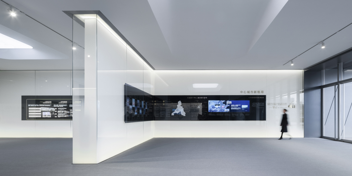 Targeting a younger audience, CR Land's Jinan No.16 Showroom is the second showroom designed by anySCALE for the company. Rectangular in shape, the forward-thinking design features two parallel thick black glass walls that hide the original site's unsightly support beams. One of the walls features a modern and fully functional cabinet that "floats" between floor and ceiling.