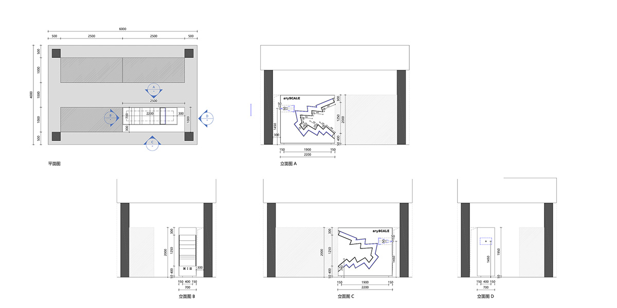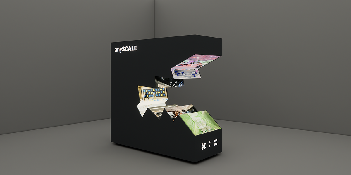 For this expo, we designed a unique booth display in the shape of a crocodile's mouth with an interactive eye. The "crocodile mouth" is a dark metal grey box, cut-away to resemble large, jagged teeth in a wide-open mouth. Such boldness and power are at first alluring. However, a closer look reveals the "teeth" as illuminated stills of award-winning and signature anySCALE projects with a further five screens showing slideshows and movies.