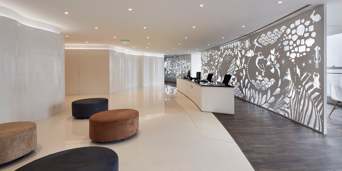From the start we had the idea of creating a white laser cutout feature wall separating reception and office space. We had in mind to tell a story related to the area in Shanghai called Donghai. For us it was very important that the story or picture we created should be first and foremost a thing of beauty. Our partner Andreas, together with designer Teresa Luo developed the idea of a child’s dream, telling the story where the dragon lives. “Showing” a dream is such a way gave us the chance to enrich the wall with all kind of creatures which could conceivably be imagined in a child’s dream.