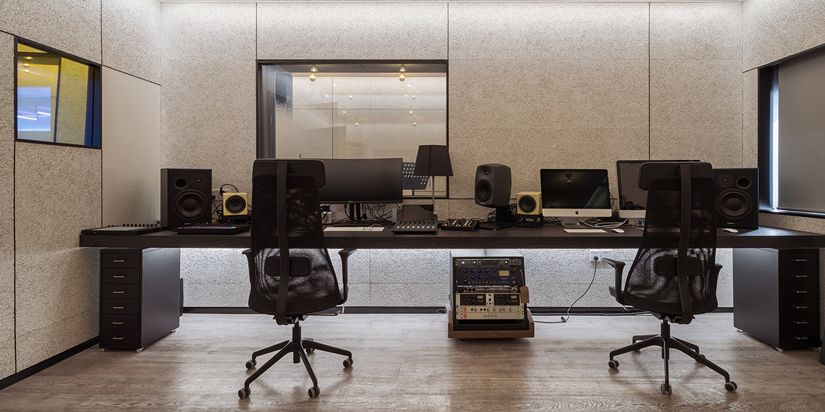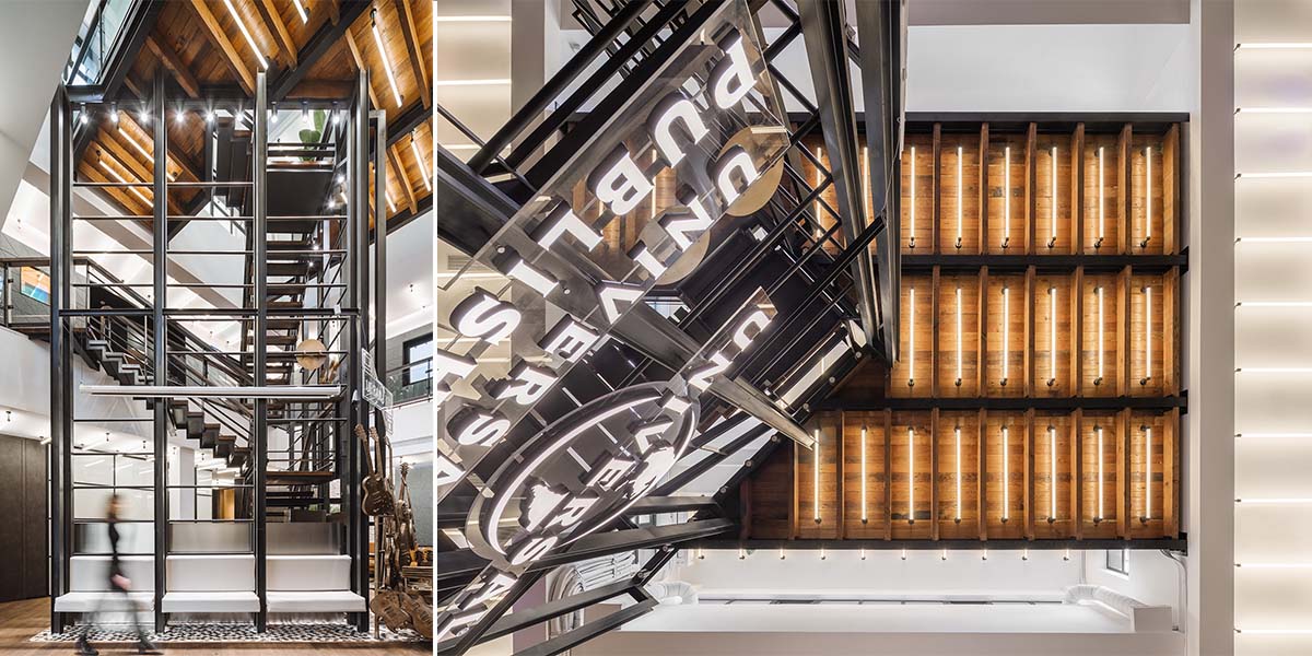 A gold-powder canopy and industrial doors with an engraved UMPG logo mark the new entrance, contrasting the building’s original industrial frame. Inside, open floor plans and a central scaffolded staircase adorned with gold and platinum records create a sense of motion and history. The ground floor functions as a reception and songwriter lounge with a stage niche framed by LED screens for performances and events, while the upper floor hosts five acoustically isolated songwriting rooms offering complete privacy for professional recording.