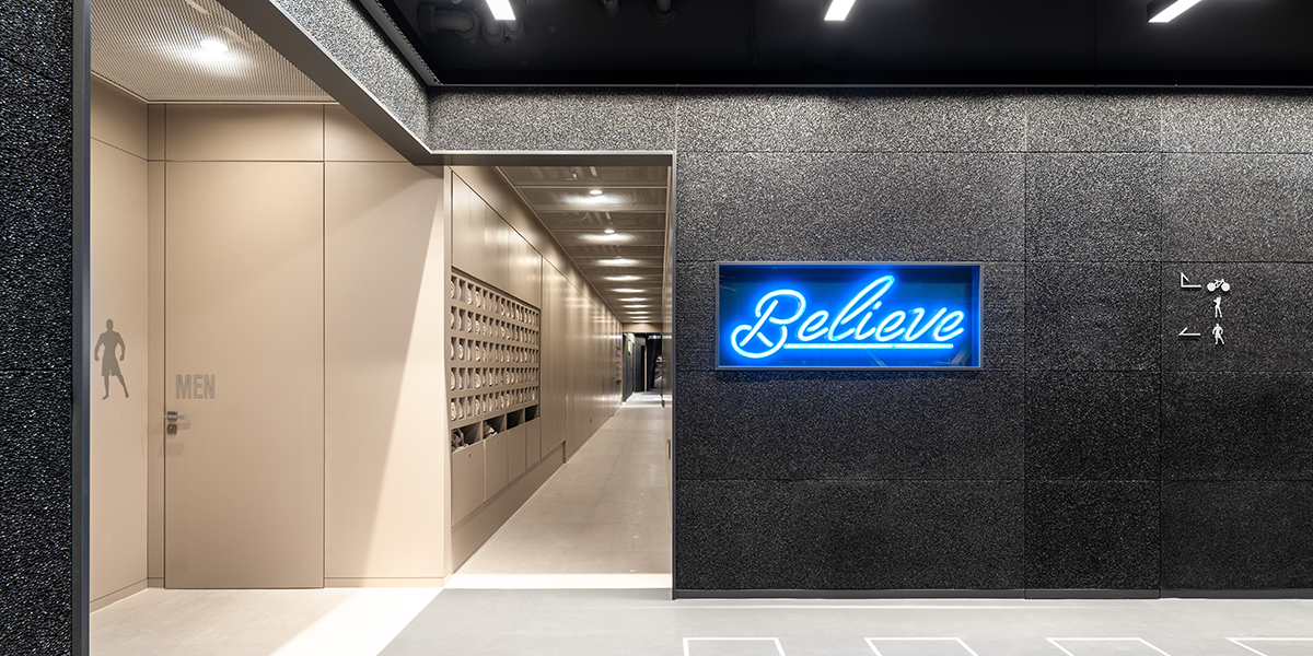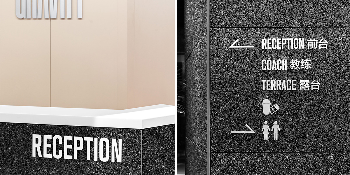 标识作为品牌在空间中的延展,统一采用金属铝板切割工艺,以干净利落的字形与符号,清晰的结构感与存在感彰显品牌形象。在这里,视觉、空间与身体训练形成共振,形成“对抗重力”的完整体验系统。