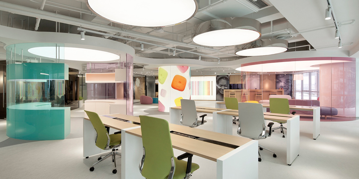 anySCALE recently decorated the interiors for the Galaxy SOHO office of Livia, a company specializing in electronic menstrual pain management products, in a manner that best presented the company spirit within a smart budget. The team created a layout for the office and product display area utilizing feminine design elements to elicit visual delight in visitors and employees. Key inspirations were colorful soap bubbles, and Livia’s own peppy and charming product.