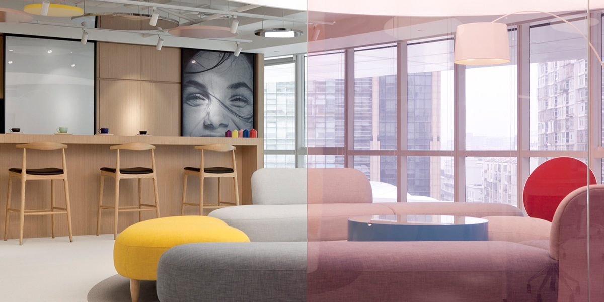 设计布局上的考量在于通过柔美流畅的弧形玻璃隔断贯穿整个空间,将休憩区、等候区、办公区及文印区等不同功能进行了流畅的切分,给予了明确的空间动线指示及定义。波龙(BOLON)编织地毯、优雅并富有生气的家具点缀,让空间不乏趣味及设计亮点。考虑到项目整体预算,设计师用国产定制灯具取代了进口灯,并用木纹防火板取代实木木饰面,双层钢化彩色夹胶玻璃改为单层,通过设计优化让项目整体造价也进行了减负,并保留了设计原有的初衷及效果。